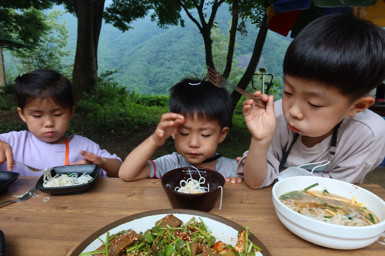 잔치국수와 도토리묵을 주문해서 었는데 아이들도 잘 먹었고 잔치국수는 뭐.. 일반적인 국수 맛이었는데 도토리묵은 새콤하니 맛있었다. 야외 테이블에서 먹고 있다 소나기가 내려 잠시 식당 건물 안에 들어가기도 했지만 비 내리는 부산집 풍경도 예뻤다. 산 중턱에 있는 식당이다보니 불편한 점도 있지만 다시 가고싶은 식당 중 하나이다.