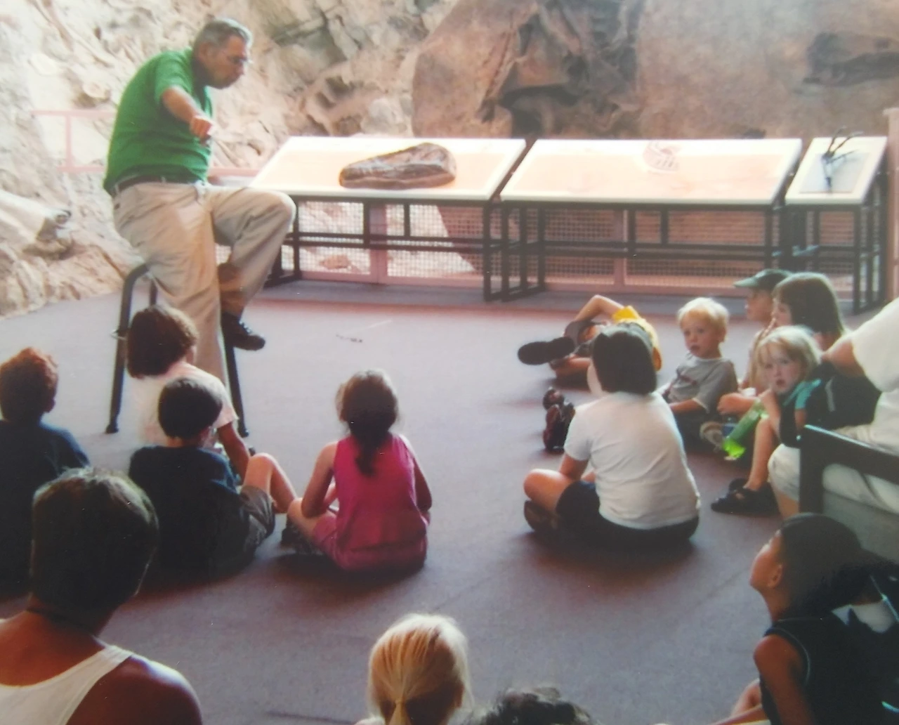 더위가 장난이 아니다. 다행히 주차장에서 Dinosaur National Monument Quarry Visitor Center 전시관까지는 관광열차처럼 생긴 셔틀버스가 무료로 운행되고 있었다. 전시관에 들어서면, 상상을 초월한 공룡 화석의 생생한 모습에 압도당했다. 공룡 표본이 협곡 암석에 묻혀있는 채로 전시관 벽이 되어 있기도 했다. 방문한 어린이들에게 공룡 화석을 설명해주는 프로그램도 마련되어 있었다. 또 직접 만져 볼 수 있도록 공룡 뼈를 따로 마련해 두고 있었다.