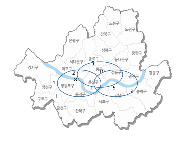 서울의 핵심구와 비 핵심구가 확연하게 차이가 나는 걸 볼 수 있을 것이다. 이 중에서 3개의 동그라미가 모두 겹쳐지는 곳이 있는데 바로 서울의 중심인 용산이다. 그리고 2개의 동그라미가 겹쳐지는 곳이 마포와 성동인 것을 알 수 있는데 이게 바로 그동안 뉴스에서 많이 나온 마용성의 실체인 셈이다.