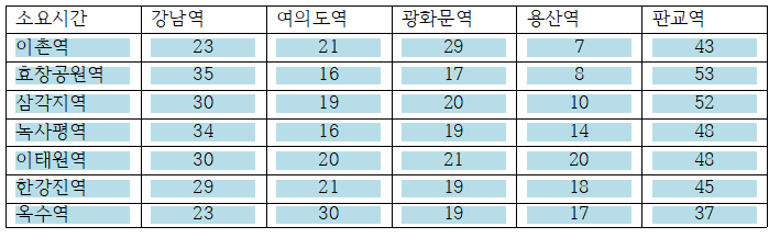 서울 한가운데 위치한 용산은 이태원과 한남동 고급 주거지역 / 일제 강점기 시대 일본 관료들의 고급 주거지이었던 이촌동 지역 / 100년 만에 되찾은 세계적인 크기의 용산공원 지역 / 한 때 좌초되었지만 다시 추진중인 용산역개발사업군 지역 / 용산 국제업무지구 개발 효과를 입을 후광지역의 5곳으로 크게 나눠볼 수 있다. 이들의 공통점은 아래 지하철 표와 같이 판교를 제외한 나머지 지역을 모두 30분 내로 갈 수 있다는 직주근접, 그리고 한강변과 용산공원의 배산임수 지역이라는 점이다. 오늘부터 이제 상기 5가지 루트를 살펴보도록 하자.
