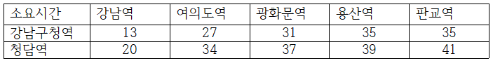 삼성동/청담동의 주요 지하철역인 강남구청역과 청담역에서 서울 주요 핵심 일자리인 강남, 여의도, 광화문, 용산, 판교까지의 소요시간을 확인해 보면 어디든 40분 내로 갈 수 있는 것을 알 수 있다.