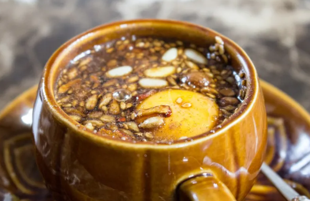 작은 사기그릇에 담긴 쌍화차 두 잔에는 검은색의 쌍화차와 각종 견과류, 대추들이 듬뿍 올라가 있었고, 한가운데는 작고 둥그런 계란 노른자가 동동 떠 있었다.