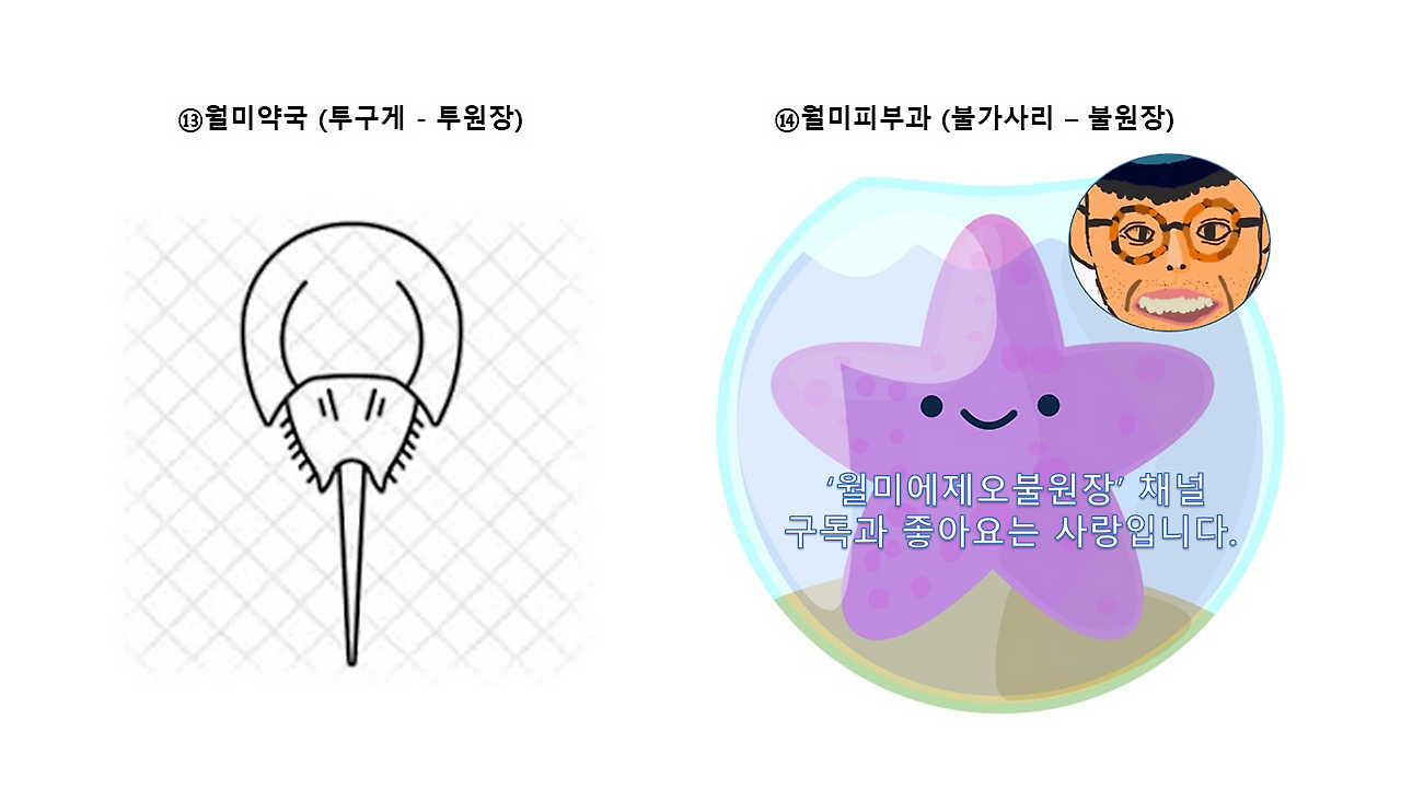 4억 5천 년 전의 모습 그대로 살아가고 있는 투구게 투원장은 월미도에서 월미약국을 꽤 오랫동안 하고 있다. 소문으로는 조선초기 이곳에 월미 한약방을 연 뒤, 일제 강점기 시대에 약국으로 변경하여 운영 중이라는 말이 있다. 투구게 투원장은 게(Crab)나 랍스터(Lobster) 같은 우리가 흔히 생각하는 갑각류가 아니라 협각류라서 실제로는 전갈과 거미에 더 가깝다. 그렇기 때문에 이곳 월미약국 곳곳에 거미줄이 쳐 있으며, 커다란 전갈들이 책상 위에 많이 돌아다니는데 모두 투원장의 친인척들이다.