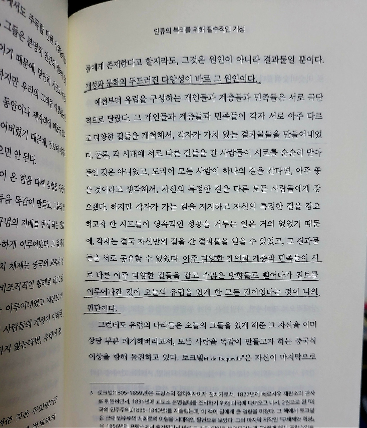 각자가 가는 길을 저지하고 자신의 특정한 길을 강요하고자 한 시도들이 영속적인 성공을 거두는 일은 거의 없었기 때문에, 각자는 결국 자신만의 길을 간 결과물을 얻을 수 있었고, 그 결과물들을 서로 공유할 수 있었다. 아주 다양한 개인과 계층과 민족들이 서로 다른 아주 다양한 길들을 잡고 수많은 방향들로 뻗어나가 진보를 이루어나간 것이 오늘의 유럽을 있게 한 모든 것이었다는 게 나의 판단이다.