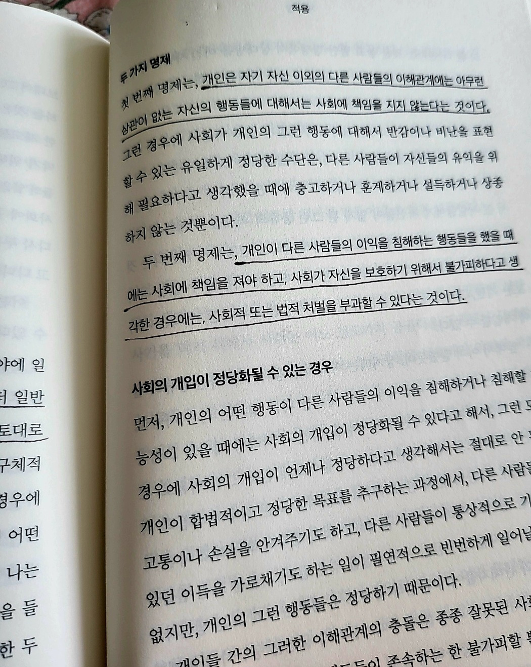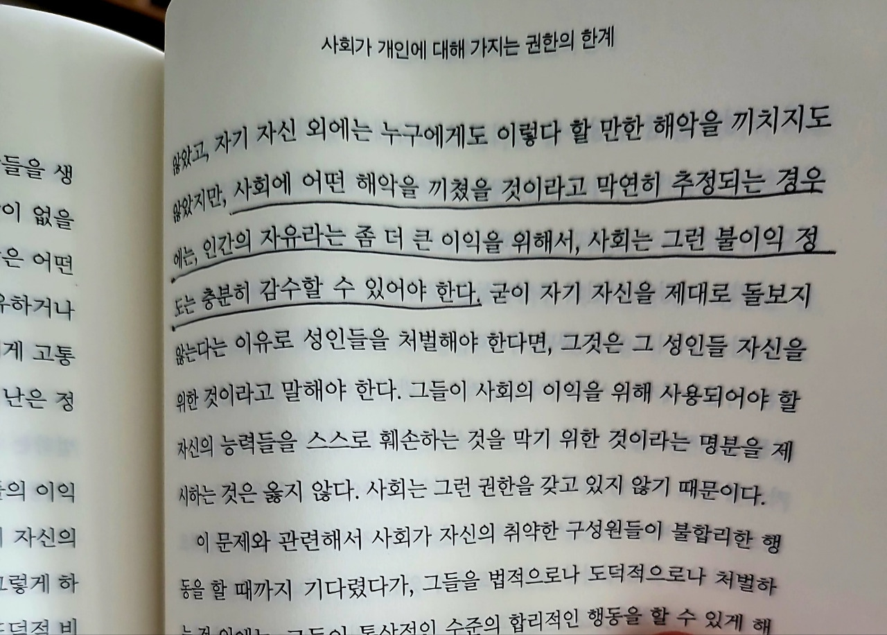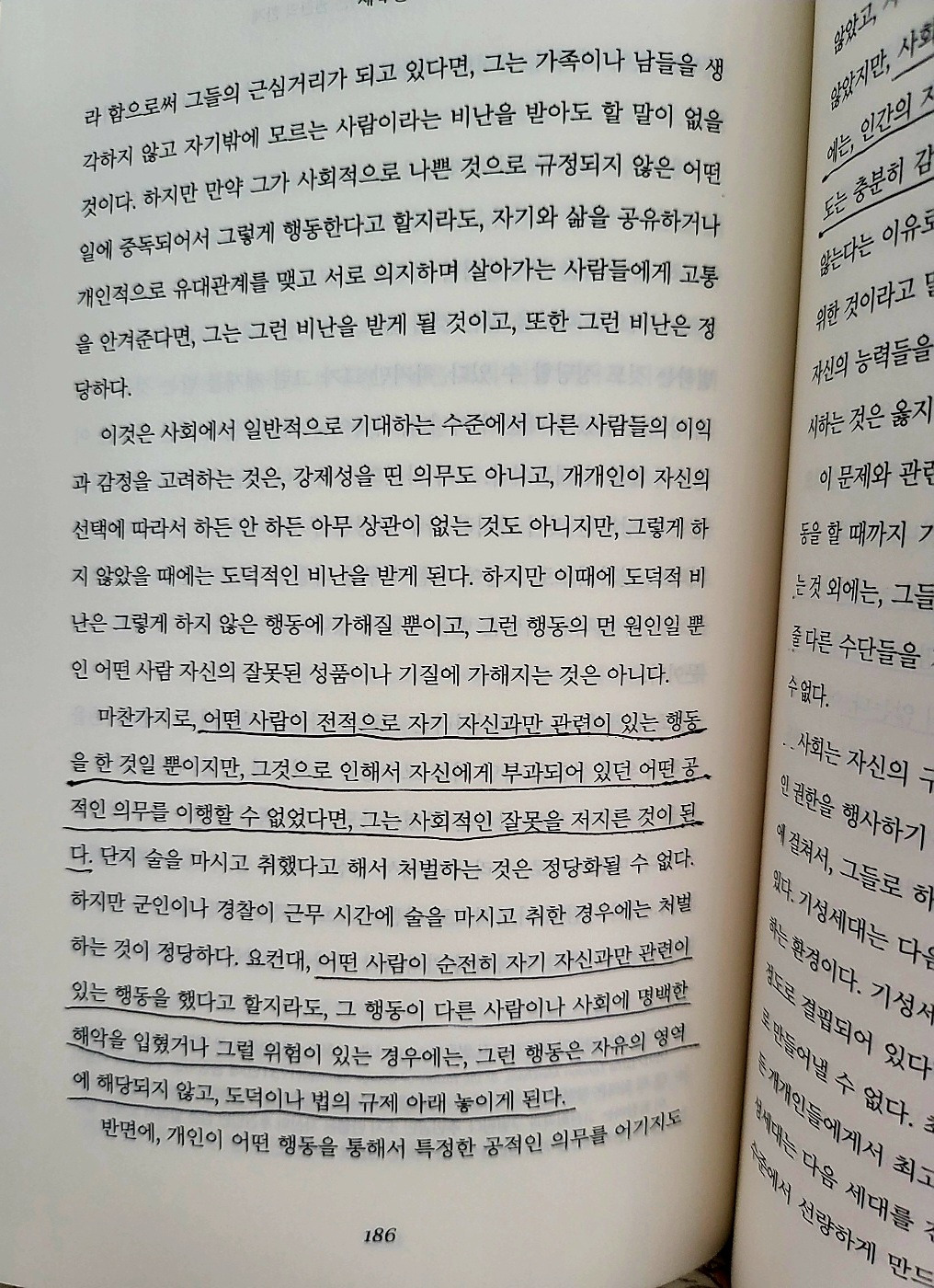 어떤 사람이 전적으로 자기 자신과만 관련이 있는 행동을 한 것일 뿐이지만, 그것으로 인해서 자신에게 부과되어 있던 어떤 공적인 의무를 이행할 수 없었다면, 그는 사회적인 잘못을 저지른 것이 된다. 요컨대, 어떤 사람이 순전히 자기 자신과만 관련이 있는 행동을 했다고 할지라도, 그 행동이 다른 사람이나 사회에 명백한 해악을 입혔거나 그럴 위험이 있는 경우에는, 그런 행동은 자유의 영역에 해당되지 않고, 도덕이나 법의 규제 아래 놓이게 된다.