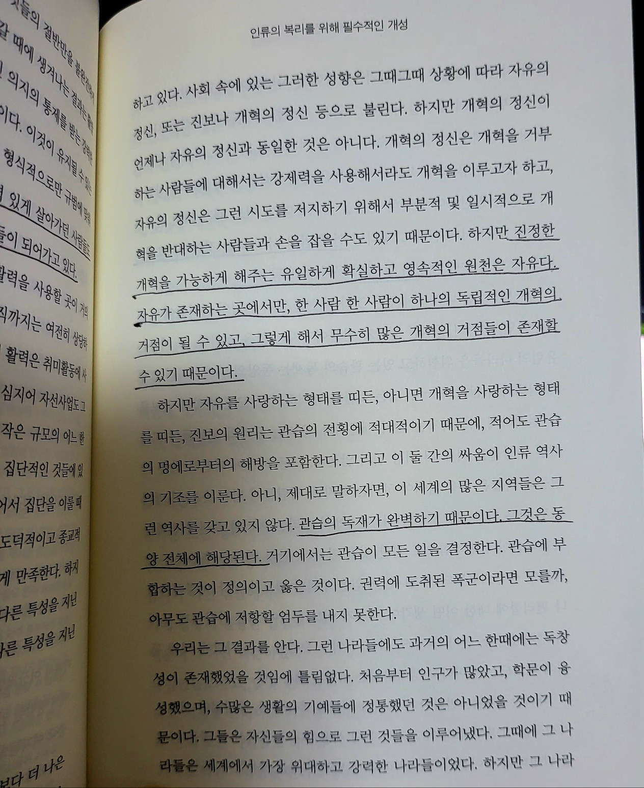 진정한 개혁을 가능하게 해주는 유일하게 확실하고 영속적인 원천은 자유다. 자유가 존재하는 곳에서만, 한 사람 한 사람이 하나의 독립적인 개혁의 거점이 될 수 있고, 그렇게 해서 무수히 많은 개혁의 거점들이 존재할 수 있기 때문이다.