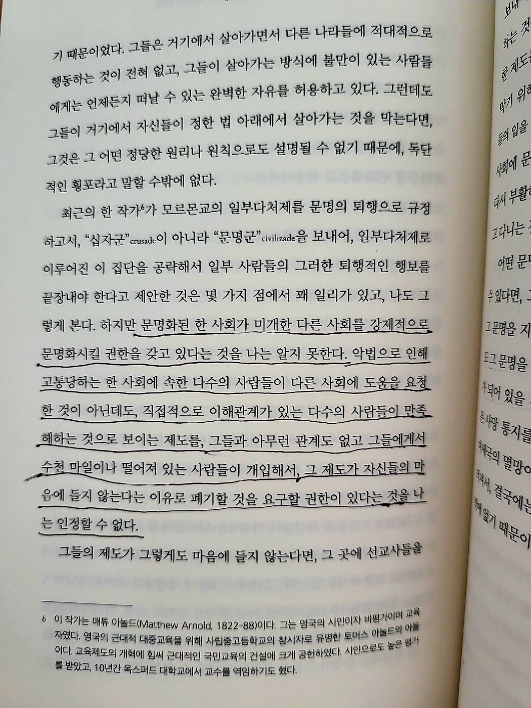 문명화된 한 사회가 미개한 다른 사회를 강제적으로 문명화시킬 권한을 갖고 있다는 것을 나는 알지 못한다. 악법으로 인해 고통당하는 한 사회에 속한 다수의 사람들이 다른 사회에 도움을 요청한 것이 아닌데도, 직접적으로 이해관계가 있는 다수의 사람들이 만족해하는 것으로 보이는 제도를, 그들과 아무런 관계가 없고 그들에게서 수천 마일이나 떨어져 있는 사람들이 개입해서, 그 제도가 자신들의 마음에 들지 않는다는 이유로 폐기할 것을 요구할 권한이 있다는 것을 나는 인정할 수 없다.
