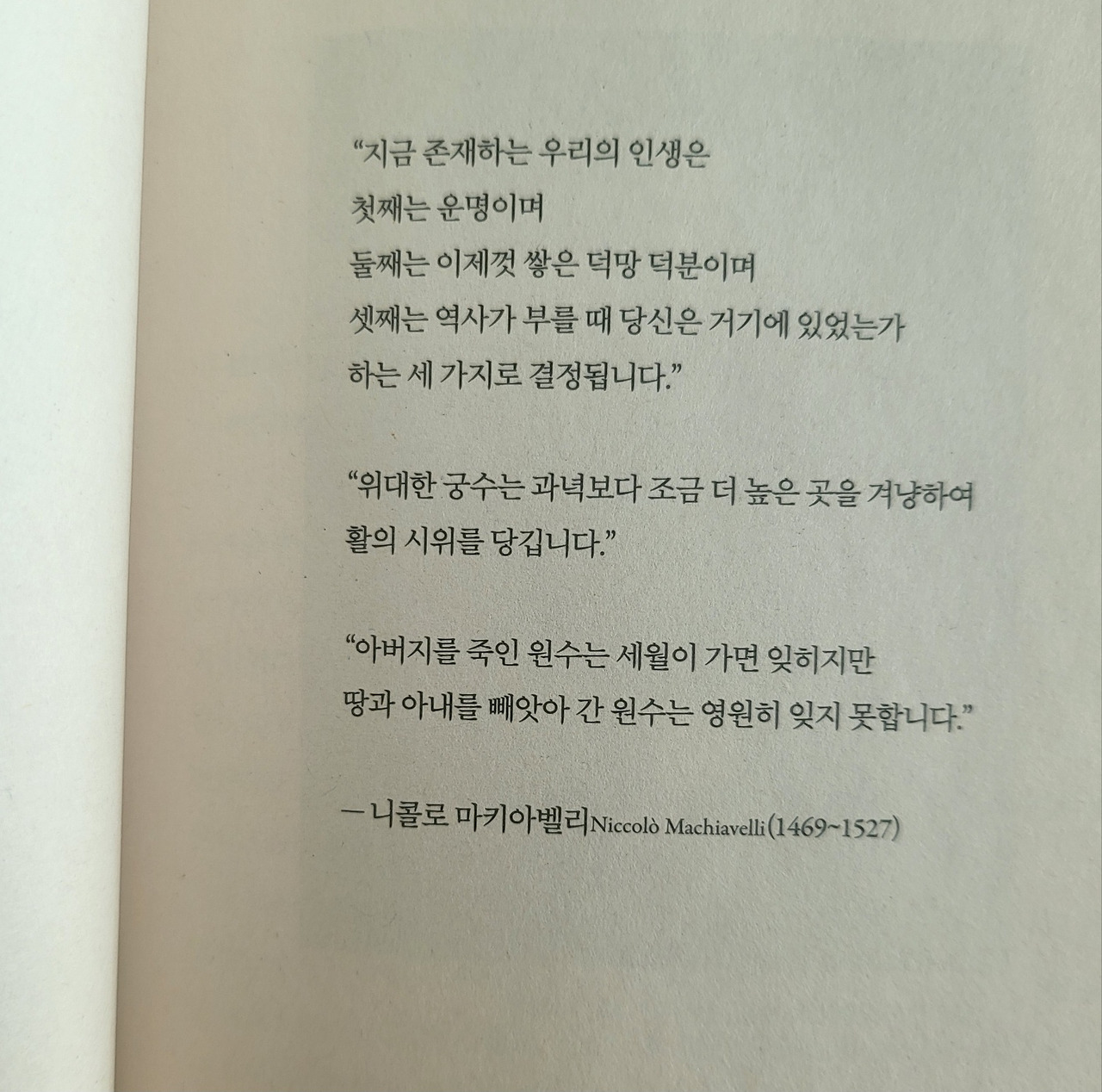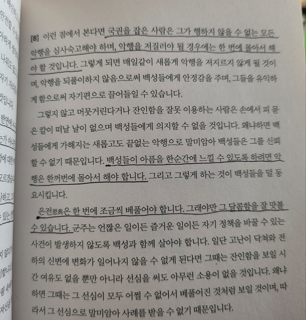 국권을 잡은 사람은 그가 행하지 않을 수 없는 모든 악행을 심사숙고해야 하며, 악행을 저질러야 될 경우에는 한 번에 몰아서 해야 할 것입니다. 백성들이 아픔을 한순간에 느낄 수 있도록 하려면 악행은 한꺼번에 몰아서 해야 합니다. 그렇게 하는 것이 백성들을 덜 동요시킵니다. 은전은 한 번에 조금씩 베풀어야 합니다. 그래야만 그 달콤함을 잘 맛볼 수 있습니다.