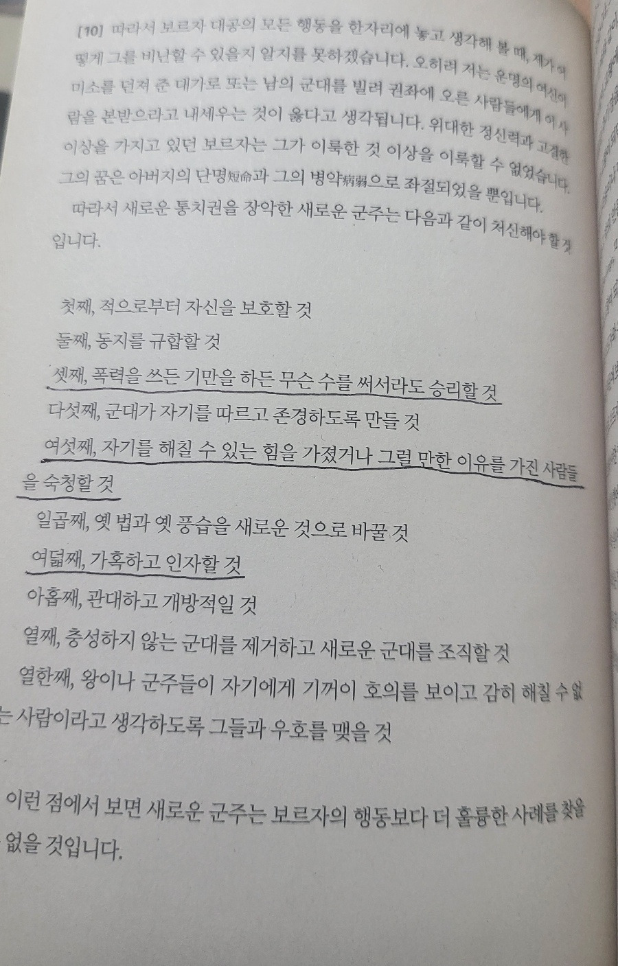 따라서 새로운 통치권을 장악한 새로운 군주는 다음과 같이 처신해야 할 것입니다. 셋째, 폭력을 쓰든 기만을 하든 무슨 수를 써서라도 승리할 것. 다섯째, 군대가 자기를 따르고 존경하도록 만들 것. 여섯째, 자기를 해칠 수 있는 힘을 가졌거나 그럴만한 이유를 가진 사람들을 숙청할 것. 여덟째, 가혹하고 인자할 것.