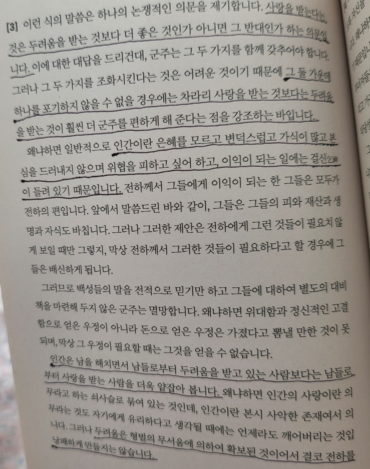 군주가 사랑을 받는다는 것은 두려움을 받는 것보다 더 좋은 것인가 아니면 그 반대인가 하는 의문입니다. 그 둘 가운데 하나를 포기하지 않을 수 없는 경우에는, 차라리 사랑을 받는 것보다는 두려움을 받는 것이 훨씬 더 군주를 편하게 해 준다는 점을 강조하는 바입니다. 왜냐하면 일반적으로 인간이란 은혜를 모르고 변덕스럽고 가식이 많고 본심을 드러내지 않으며 위협을 피하고 싶어 하고 이익이 되는 일에는 걸신이 들려 있기 때문입니다. 인간은 남을 해치면서 남들로부터 두려움을 받고 있는 사람보다는 남들로부터 사랑을 받는 사람을 더욱 얕잡아 봅니다.