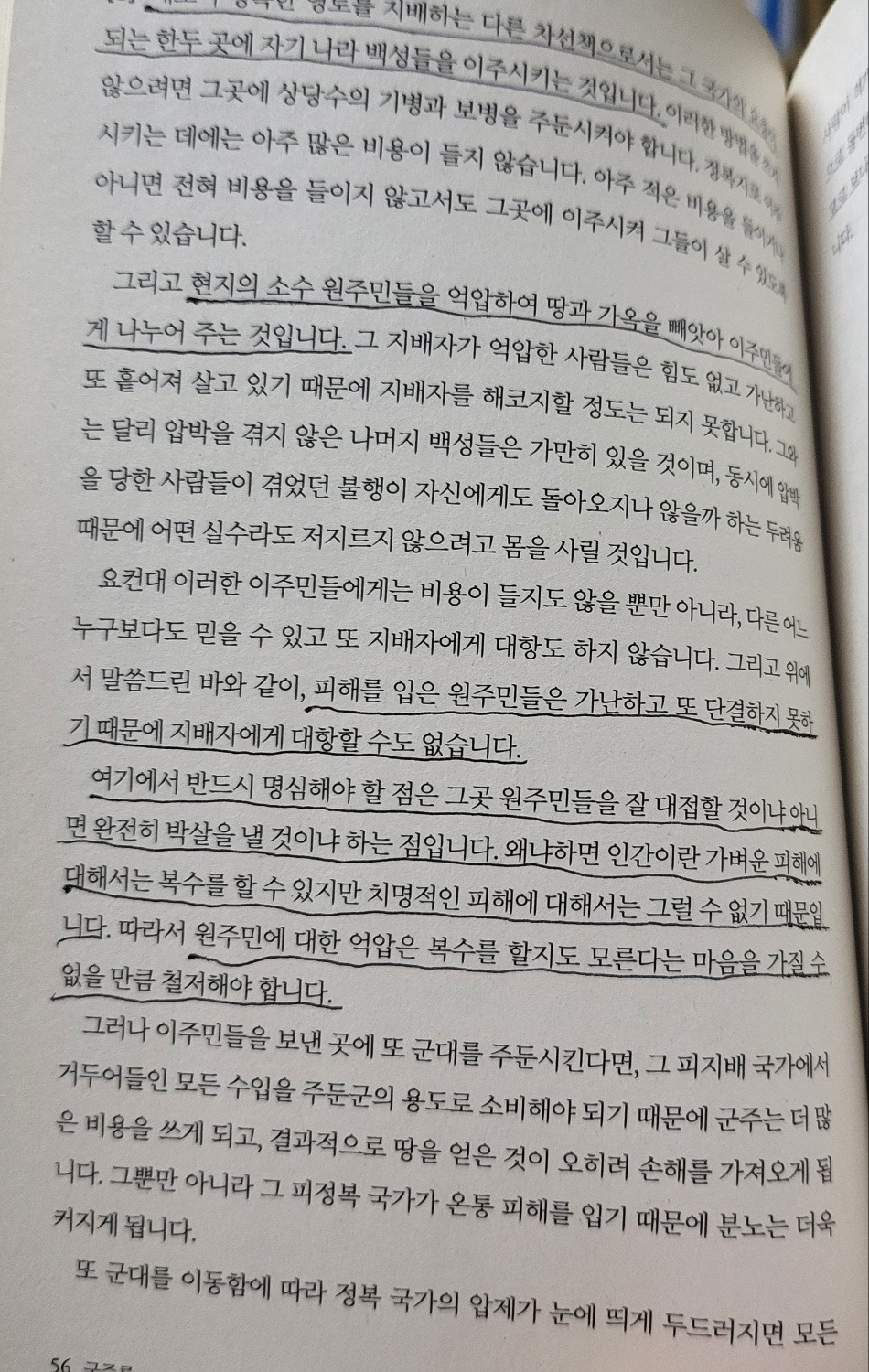 여기에서 반드시 명심해야 할 점은, 그곳 원주민들을 잘 대접할 것이냐 아니면 완전히 박살을 낼 것이냐 하는 점입니다. 왜냐하면 인간이란 가벼운 피해에 대해서는 복수를 할 수 있지만, 치명적인 피해에 대해서는 그럴 수 없기 때문입니다. 따라서 원주민에 대한 억압은 복수를 할지도 모른다는 마음을 가질 수 없을 만큼 철저해야 합니다.