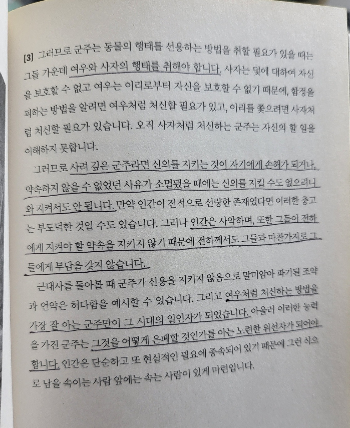 군주가 동물의 형태를 선용하는 방법을 취할 필요가 있을 때는, 그들 가운데 여우와 사자의 형태를 취해야 합니다. 사려 깊은 군주라면 신의를 지키는 것이 자기에게 손해가 되거나, 약속하지 않을 수 없었던 사유가 소멸됐을 때에는 신의를 지킬 수도 없으려니와 지켜서도 안 됩니다. 인간은 사악하며, 또한 그들이 전하에게 지켜야 할 약속을 지키지 않기 때문에 전하께서도 그들과 마찬가지로 그들에게 부담을 갖지 않습니다. 여우처럼 처신하는 방법을 가장 잘 아는 군주만이 그 시대의 일인자가 되었습니다. 이러한 능력을 가진 군주는 그것을 어떻게 은폐할 것인가를 아는 노련한 위선자가 되어야 합니다.