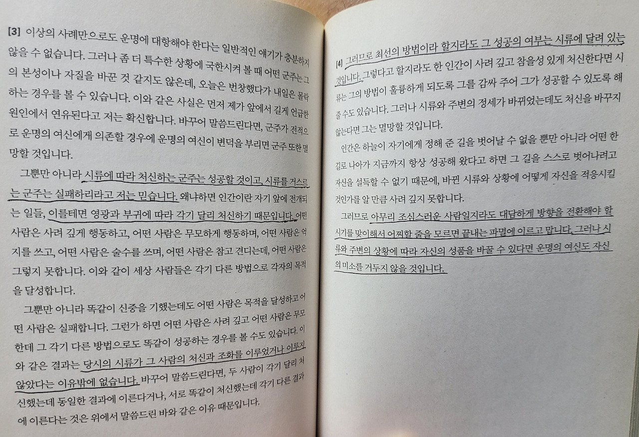시류에 따라 처신하는 군주는 성공할 것이고, 시류를 거스르는 군주는 실패하리라고 저는 믿습니다. 성공과 실패의 결과는 당시의 시류가 그 사람의 처신과 조화를 이루었거나 이루지 않았다는 이유밖에 없습니다. 최선의 방법이라 할지라도 그 성공의 여부는 시류에 달려 있는 것입니다. 아무리 조심스러운 사람일지라도 대담하게 방향을 전환해야 할 시기를 맞이해서 어찌할 줄을 모르면 끝내는 파멸에 이르고 맙니다. 그러나 시류와 주변 상황에 따라 자신의 성품을 바꿀 수 있다면, 운명의 여신도 자신의 미소를 거두지 않을 것입니다.