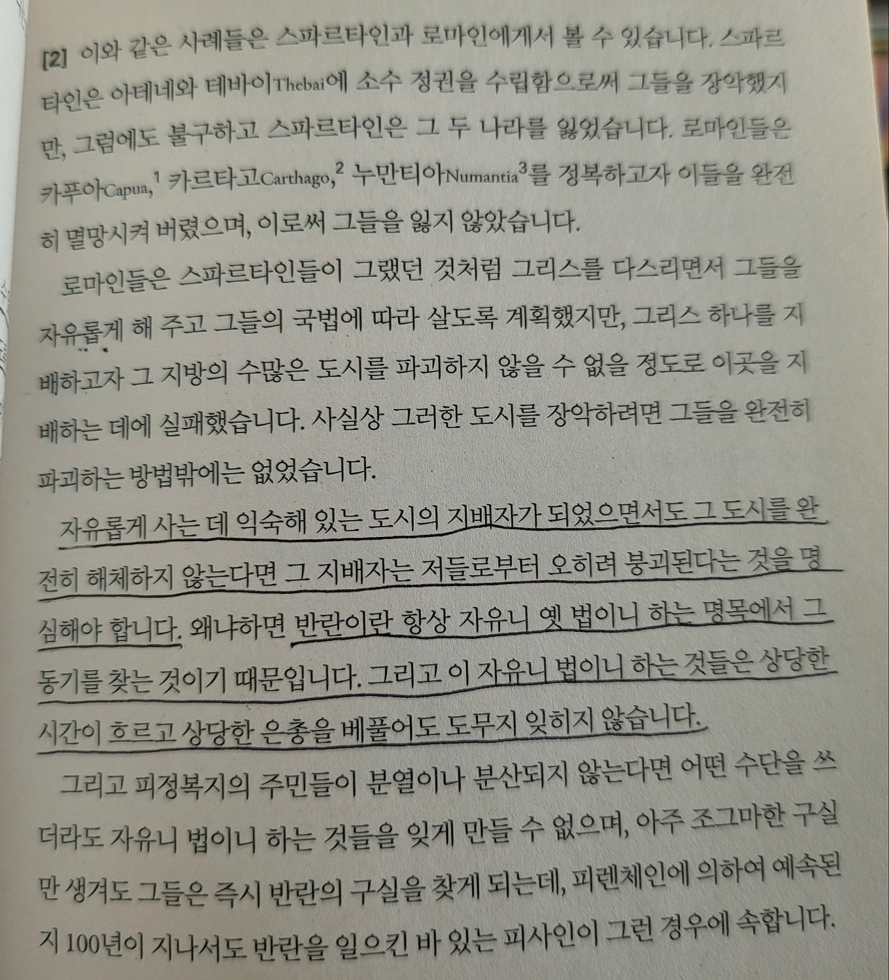 자유롭게 사는 데 익숙해 있는 도시의 지배자가 되었으면서도 그 도시를 완전히 해체하지 않는다면, 그 지배자는 저들로부터 오히려 붕괴된다는 것을 명심해야 합니다. 왜냐하면 반란이란 항상 자유니 옛 법이니 하는 명목에서 그 동기를 찾는 것이기 때문입니다. 그리고 이 자유니 법이니 하는 것들은 상당한 시간이 흐르고 상당한 은총을 베풀어도 도무지 잊히지 않습니다.