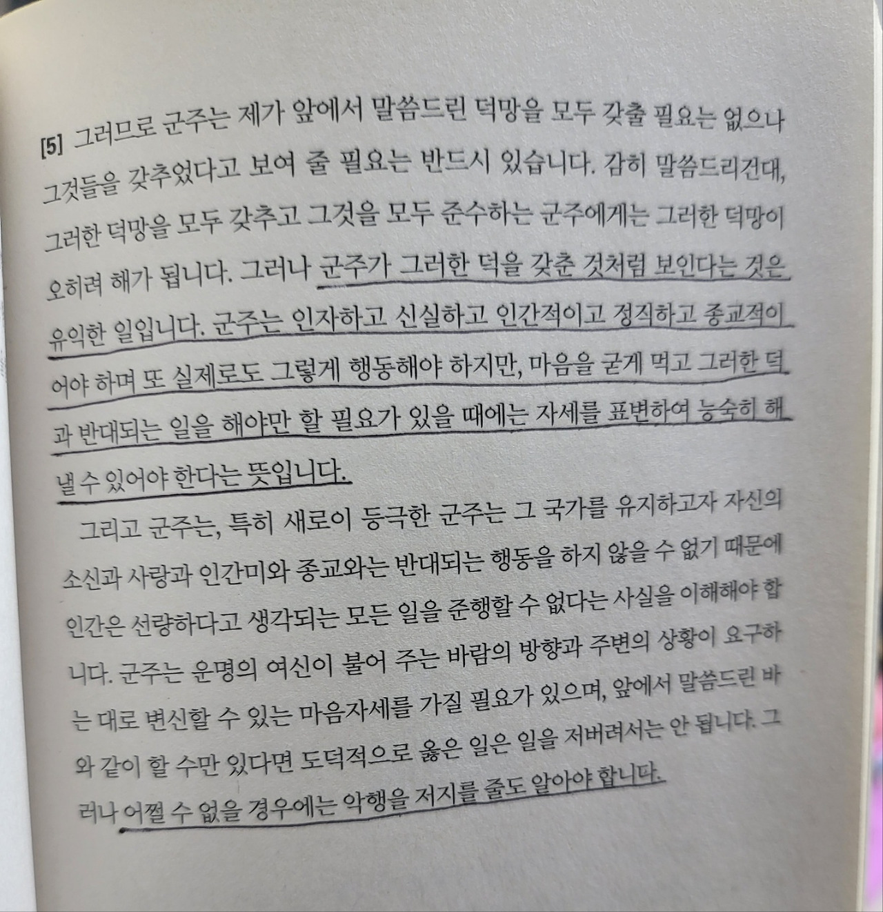 군주가 덕을 갖춘 것처럼 보인다는 것은 유익한 일입니다. 군주는 인자하고 신실하고 인간적이고 정직하고 종교적이어야 하며 또 실제로도 그렇게 행동해야 하지만, 마음을 굳게 먹고 그러한 덕과 반대되는 일을 해야만 할 필요가 있을 때에는 자세를 표변하여 능숙히 해낼 수 있어야 한다는 뜻입니다. 할 수만 있다면 도덕적으로 옳은 일을 저버려서는 안 됩니다. 그러나 어쩔 수 없을 경우에는 악행을 저지를 줄도 알아야 합니다.