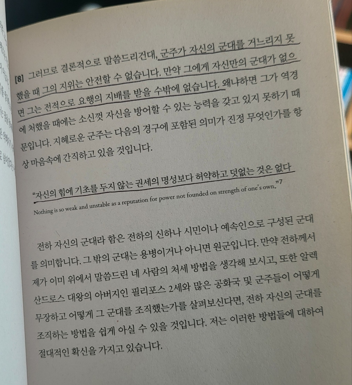 군주가 자신의 군대를 거느리지 못했을 때, 그의 지위는 안전할 수 없습니다. 만약 그에게 자신만의 군대가 없으면, 그는 전적으로 요행의 지배를 받을 수밖에 없습니다. "자신의 힘에 기초를 두지 않는 권세의 명성보다 허약하고 덧없는 것은 없다."