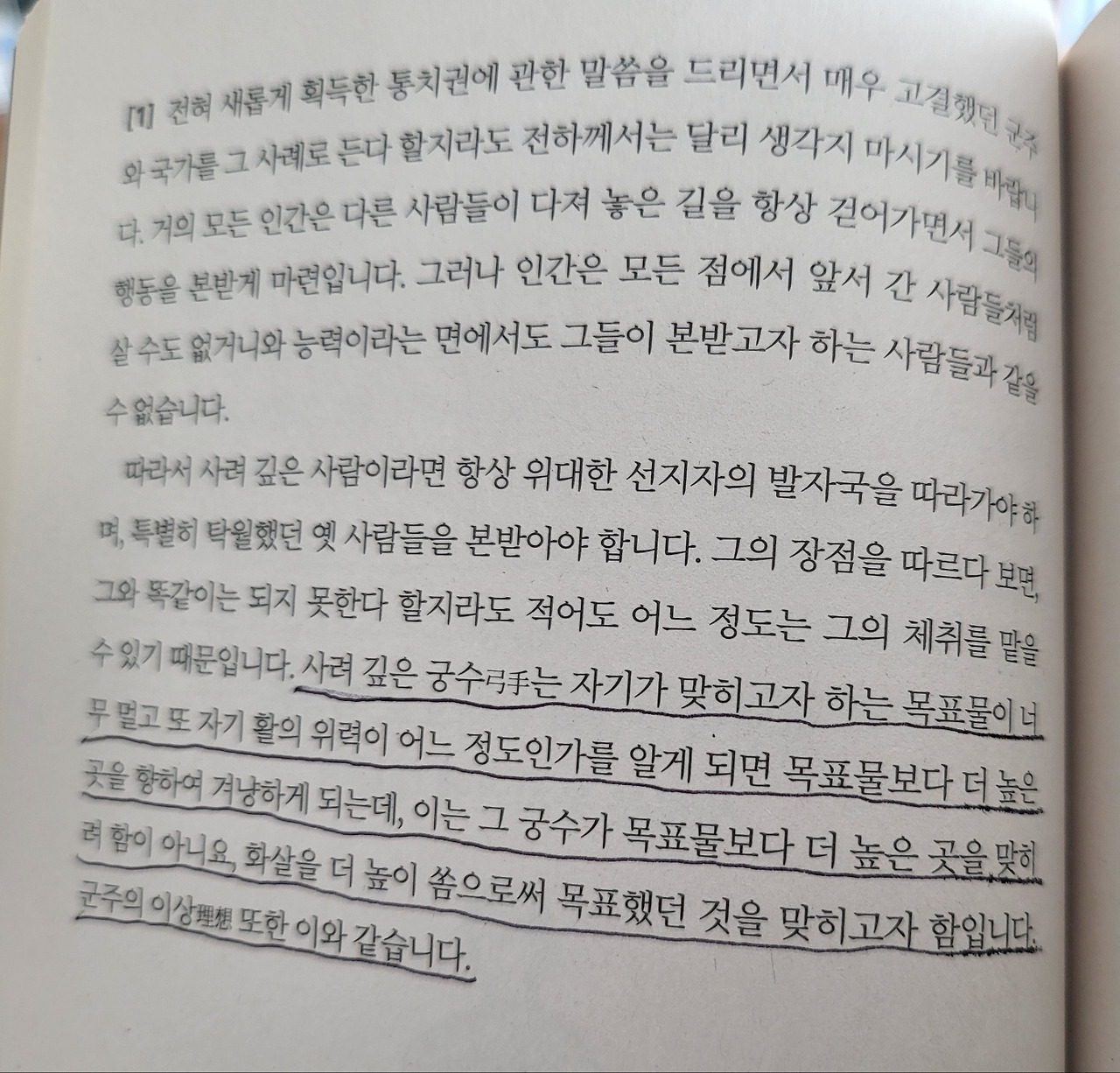 사려 깊은 궁수는 자기가 맞히고자 하는 목표물이 너무 멀고 또 자기 활의 위력이 어느 정도인가를 알게 되면 목표물보다 더 높은 곳을 향하여 겨냥하게 되는데. 이는 그 궁수가 목표물보다 더 높은 곳을 맞히려 함이 아니요, 화살을 더 높이 쏨으로써 목표했던 것을 맞히고자 함입니다. 군주의 이상 또한 이와 같습니다.