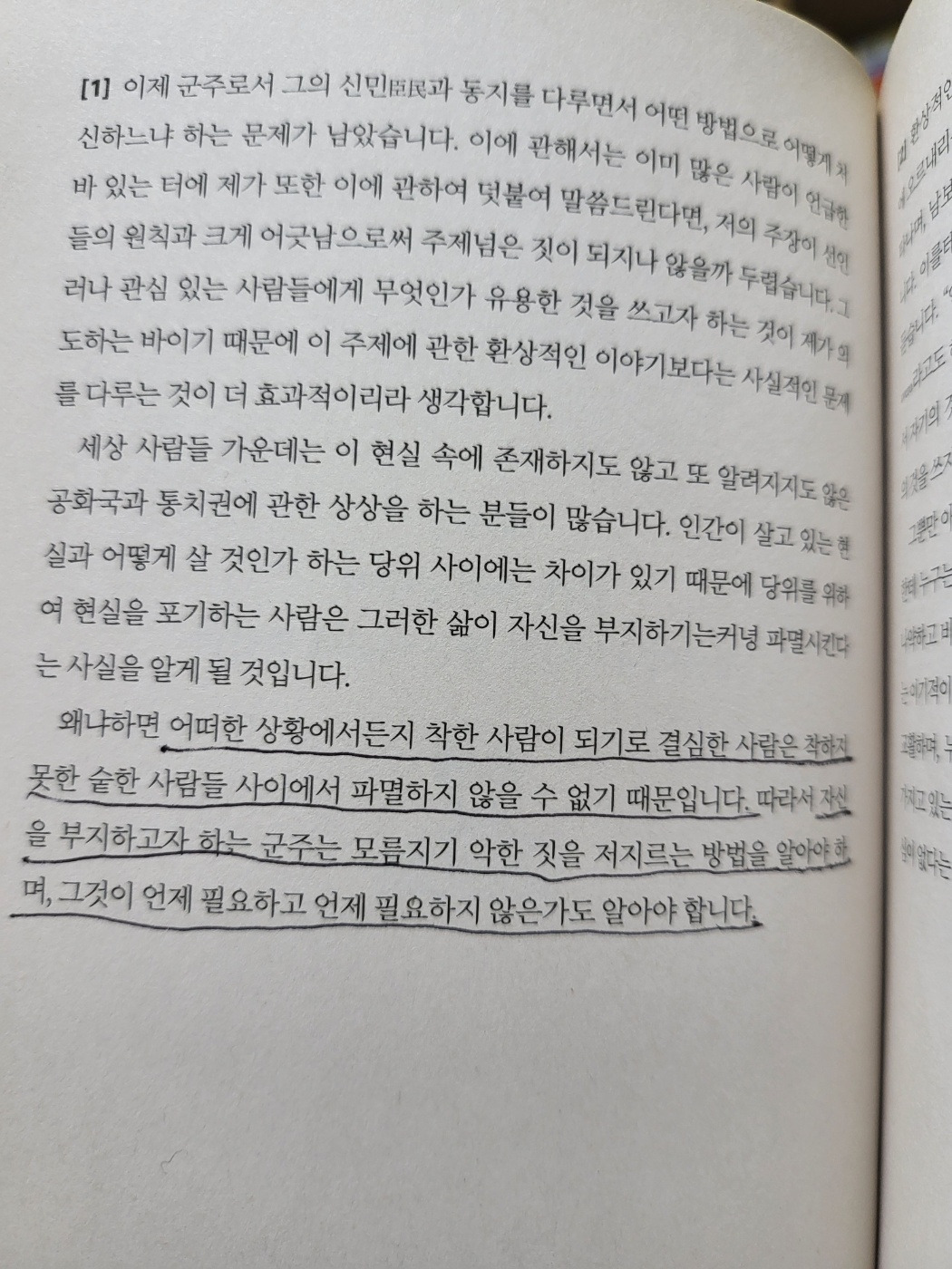 어떠한 상황에서든지 착한 사람이 되기로 결심한 사람은, 착하지 못한 숱한 사람들 사이에서 파멸하지 않을 수 없기 때문입니다. 따라서 자신을 부지하고자 하는 군주는 모름지기 악한 짓을 저지르는 방법을 알아야 하며, 그것이 언제 필요하고 언제 필요하지 않은가도 알아야 합니다.