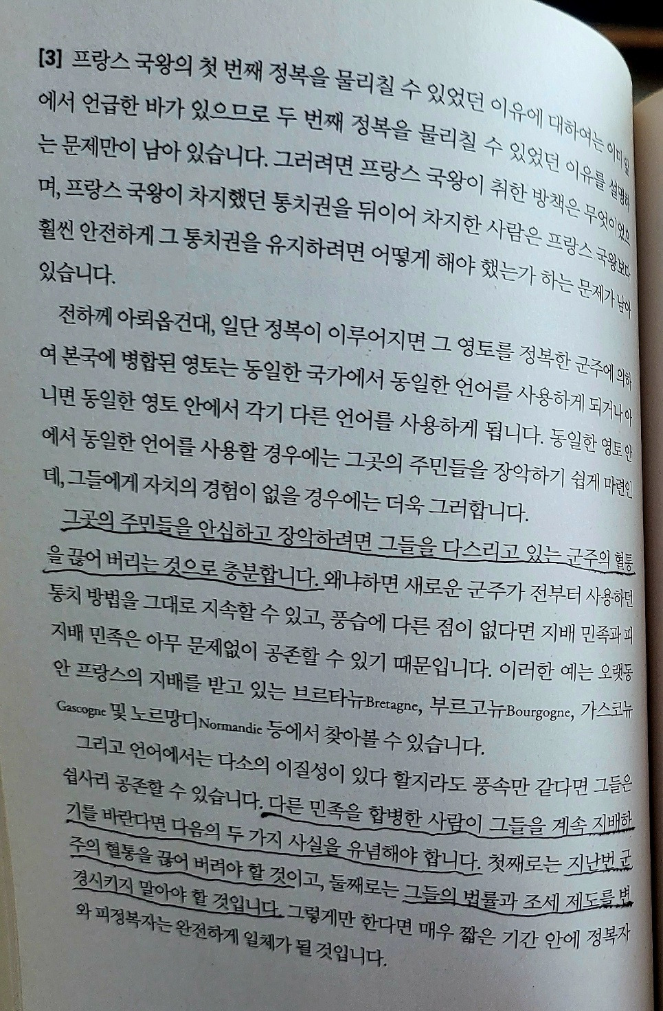다른 민족을 합병한 사람이 그들을 계속 지배하기를 바란다면, 다음의 두 가지 사실을 유념해야 합니다. 첫째로는 지난번 군주의 혈통을 끊어 버려야 할 것이고, 둘째로는 그들의 법률과 조세 제도를 변경시키지 말아야 할 것입니다. 그렇게만 한다면 매우 짧은 기간 안에 정복자와 피정복자는 완전하게 일체가 될 것입니다.