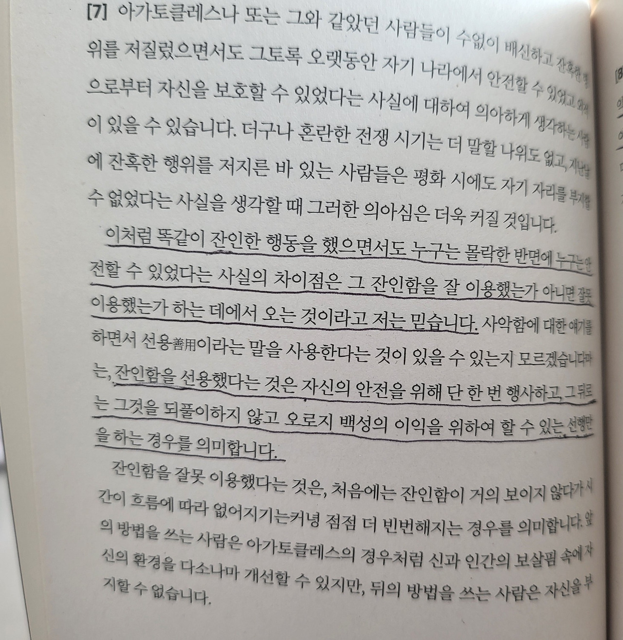 똑같이 잔인한 행동을 했으면서도 누구는 몰락한 반면에 누구는 안전할 수 있었다는 사실의 차이점은, 그 잔인함을 잘 이용했는가 아니면 잘못 이용했는가 하는 데에서 오는 것이라고 저는 믿습니다. 잔인함을 선용했다는 것은 자신의 안전을 위해 단 한 번 행사하고, 그 뒤로는 그것을 되풀이하지 않고 오로지 백성의 이익을 위하여 할 수 있는 선행만을 하는 경우를 의미합니다.