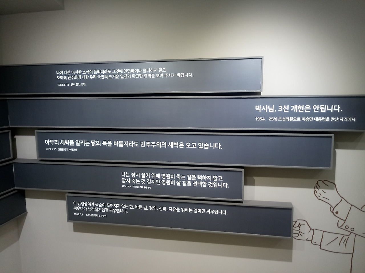 영상실을 지나가면 김영삼 대통령의 다양한 사진들과 명언들을 만나볼 수 있다. 김영삼 대통령은 생전에 여러 명언들을 남겼다. 이 가운데 개인적으로 가장 좋아하는 말은 "아무리 닭의 목을 비틀지라도 새벽이 온다는 것을 잊어서는 안 된다"라는 것이다. 독재 정권이 민주주의를 열망하는 이들을 모질게 탄압한다 해도, 민주주의의 새벽은 반드시 온다는 것을 의미한다. 이 명언은 그 당시 수많은 사람들에게 커다란 힘이 됐다.