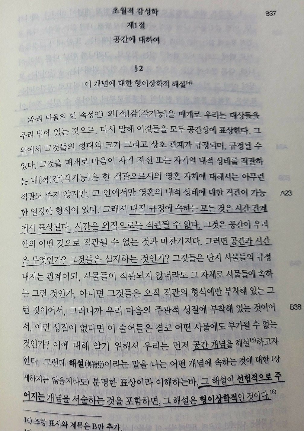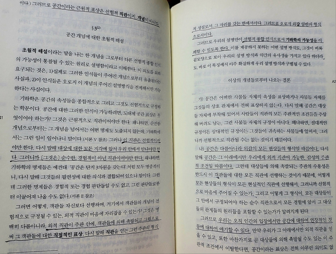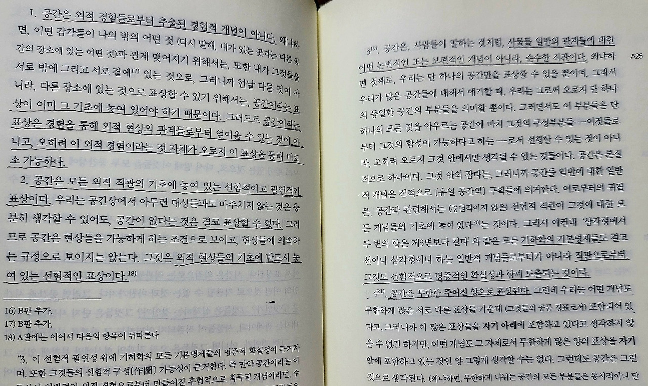공간은 외적 경험들로부터 추출된 경험적 개념이 아니다. 공간이라는 표상은 경험을 통해 외적 현상의 관계들로부터 얻어올 수 있는 것이 아니고, 오히려 이 외적 경험이라는 것 자체가 오로지 이 표상을 통해 비로소 가능하다. 공간은 모든 외적 직관의 기초에 놓여 있는 선험적이고 필연적인 표상이다. 공간이 없다는 것은 결코 표상할 수 없다. 그것은 외적 현상들의 기초에 반드시 놓여 있는 선험적인 표상이다.