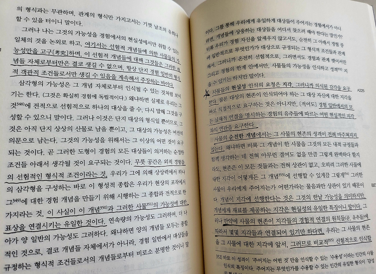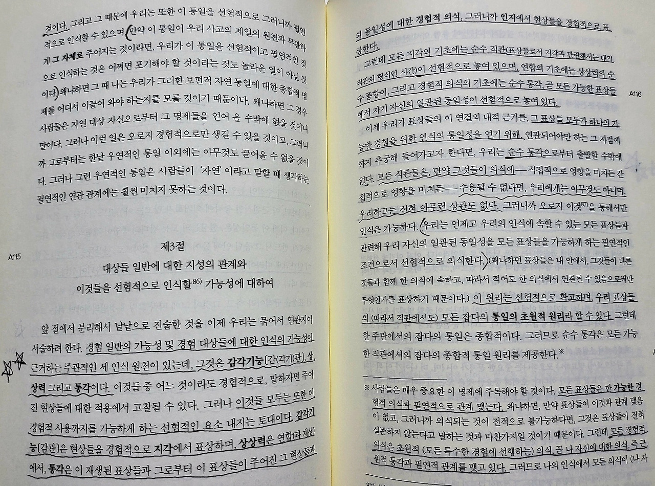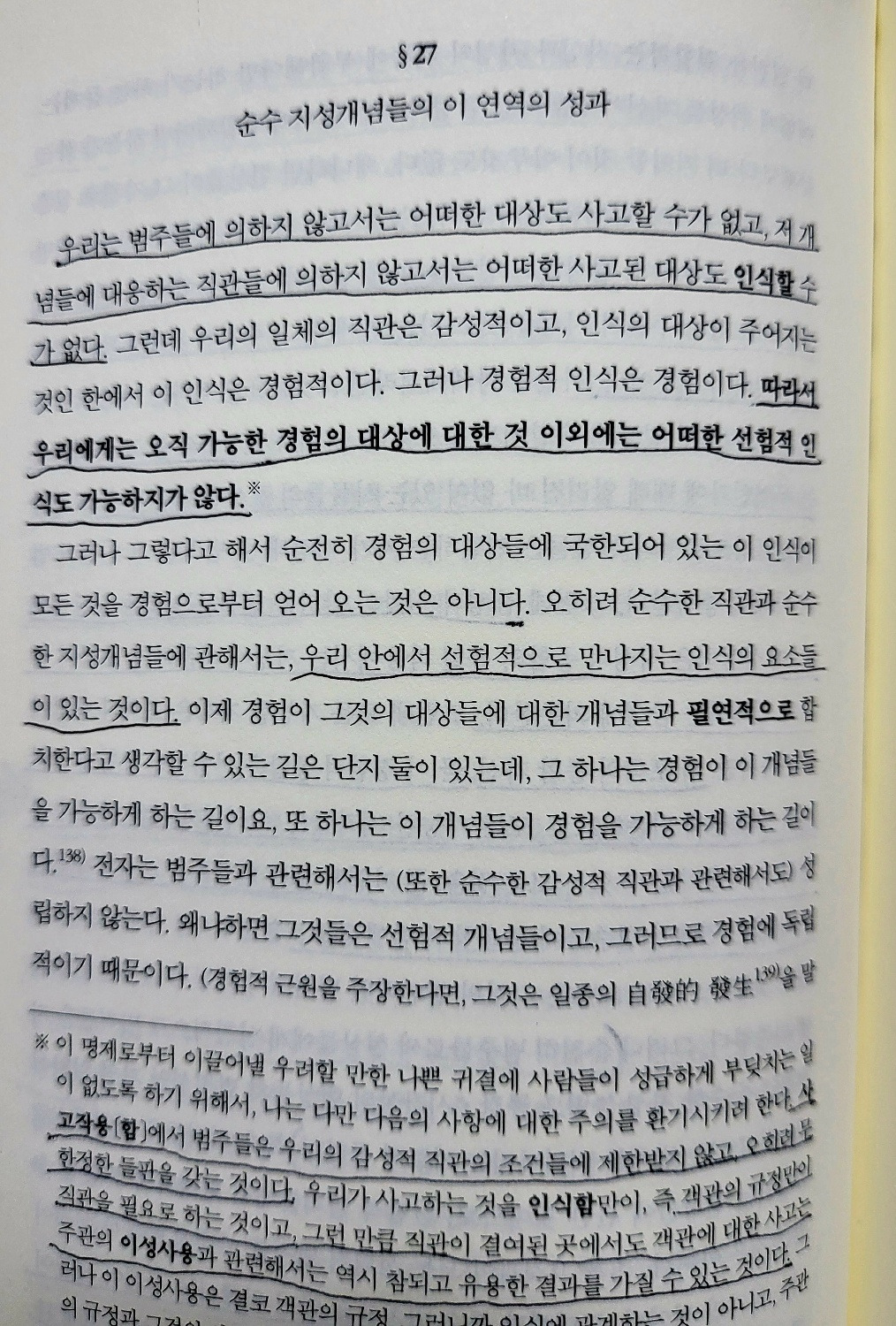 우리는 범주들에 의하지 않고서는 어떠한 대상도 사고할 수가 없고, 저 개념들에 대응하는 직관들에 의하지 않고서는 어떠한 사고된 대상도 인식할 수 없다. 따라서 우리에게는 오직 가능한 경험의 대상에 대한 것 이외에는 어떠한 선험적 의식도 가능하지가 않다.