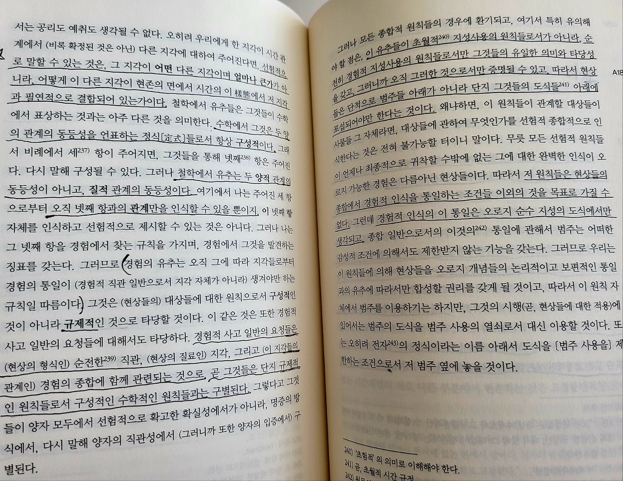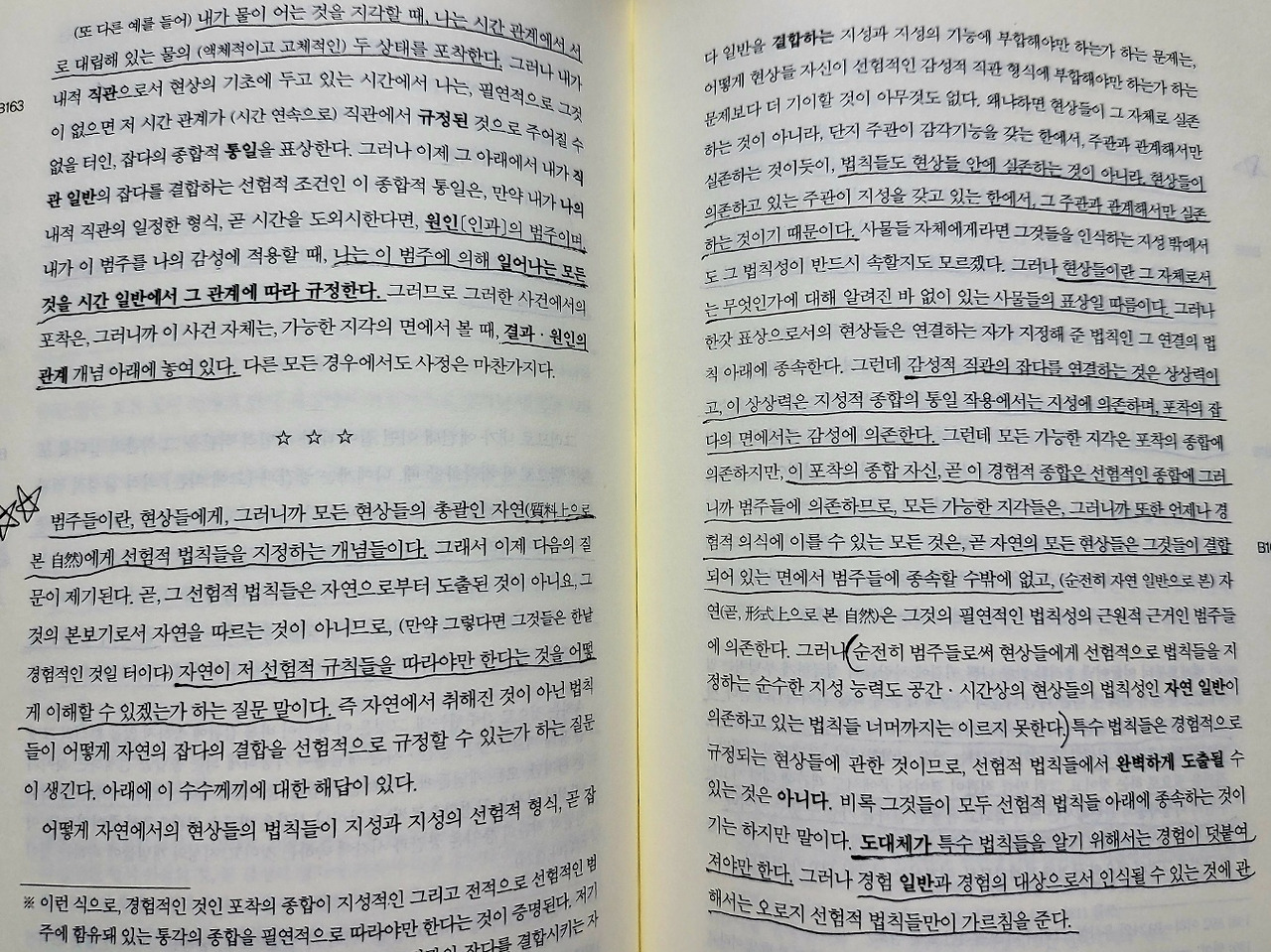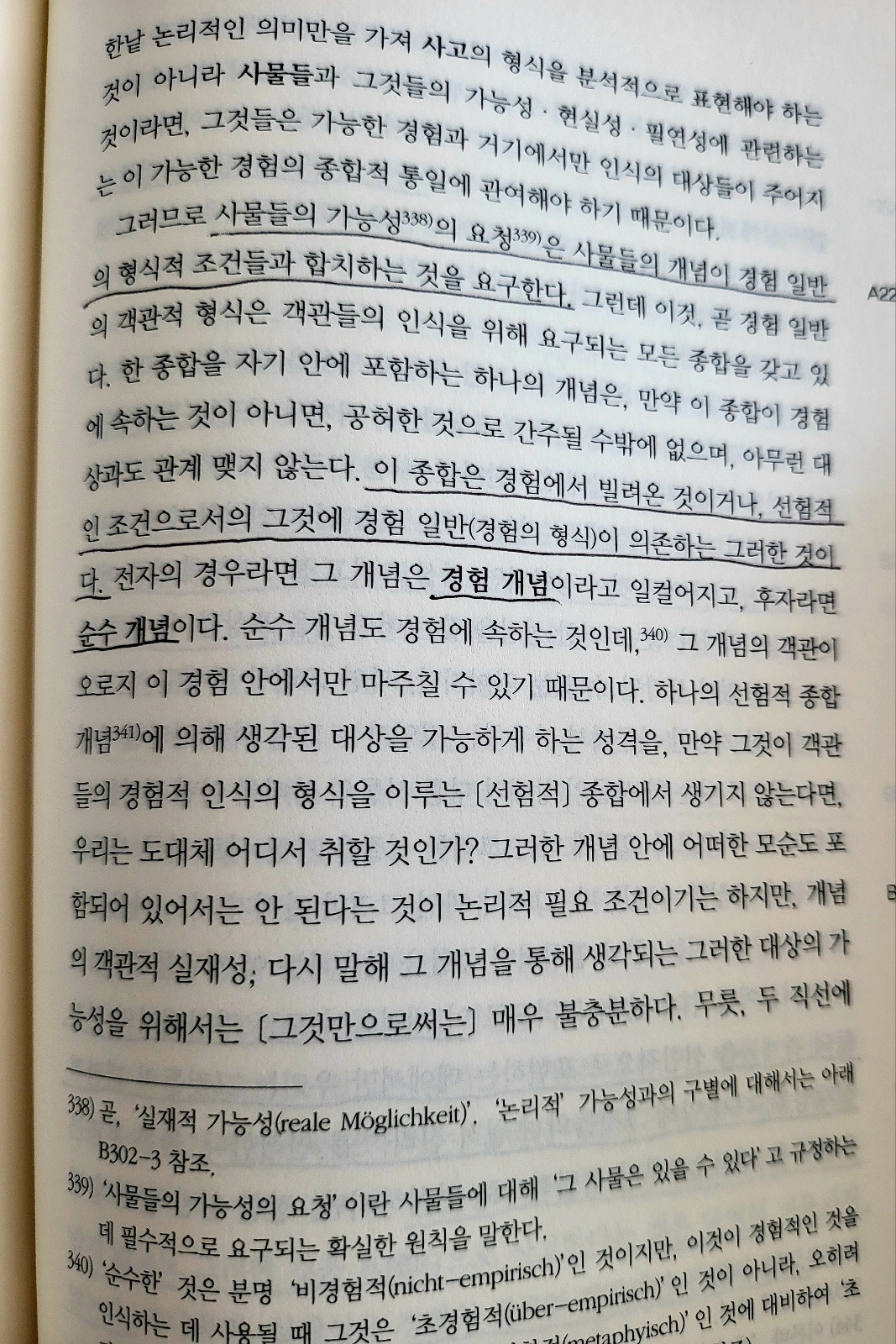 우리는 범주들에 의하지 않고서는 어떠한 대상도 사고할 수가 없고, 저 개념들에 대응하는 직관들에 의하지 않고서는 어떠한 사고된 대상도 인식할 수 없다. 따라서 우리에게는 오직 가능한 경험의 대상에 대한 것 이외에는 어떠한 선험적 의식도 가능하지가 않다.