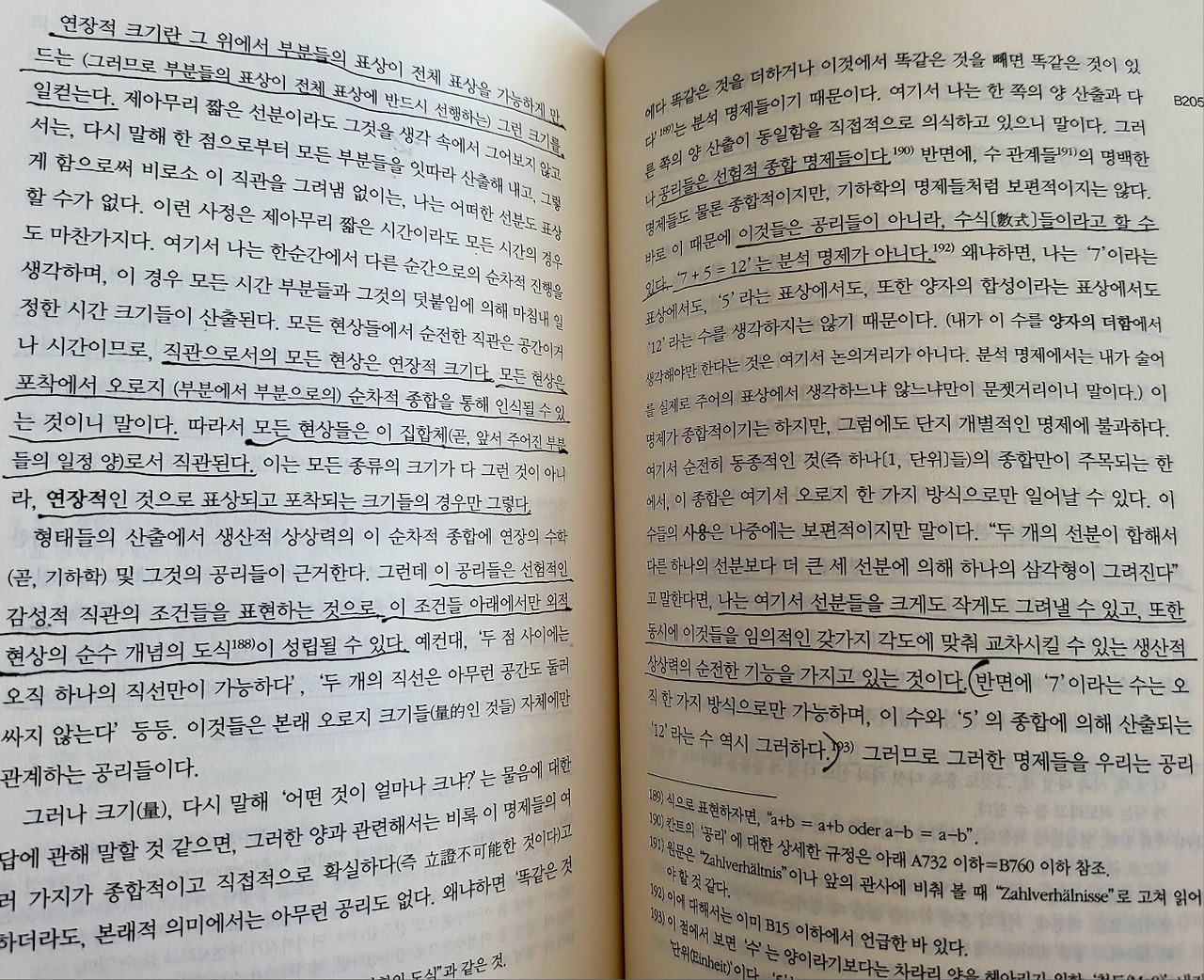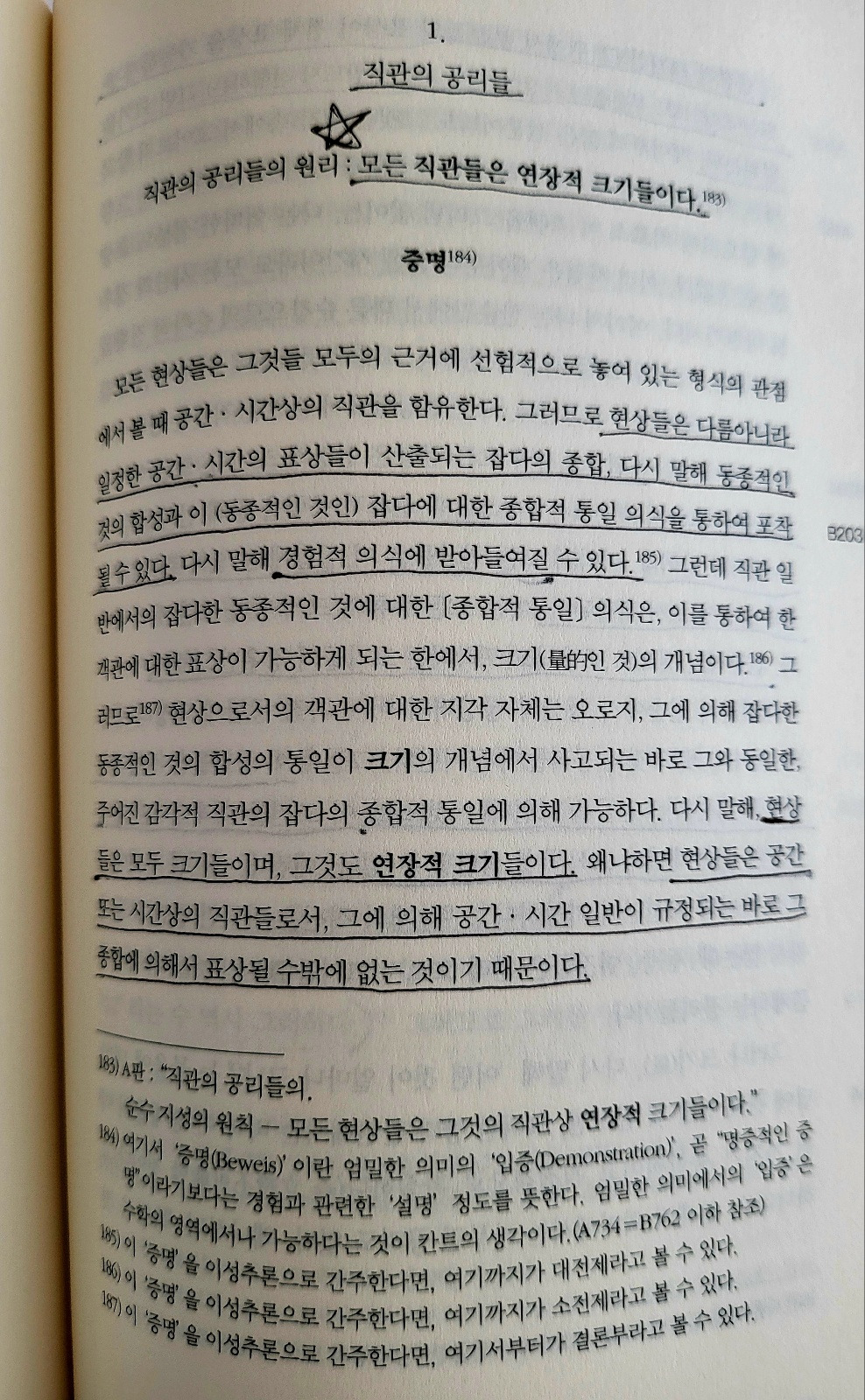 연장적 크기란, 그 위에서 부분들의 표상이 전체 표상을 가능하게 만드는 그런 크기를 일컫는다. 직관으로서의 모든 현상은 연장적 크기다. 모든 현상은 포착에서 오로지 (부분에서 부분으로의) 순차적 종합을 통해 인식될 수 있는 것이니 말이다. 따라서 모든 현상들은 이 집합체(앞서 주어진 부분들의 일정 양)로서 직관된다. 이는 모든 종류의 크기가 다 그런 것이 아니라, 연장적인 것으로 표상되고 포착되는 크기들의 경우만 그렇다.