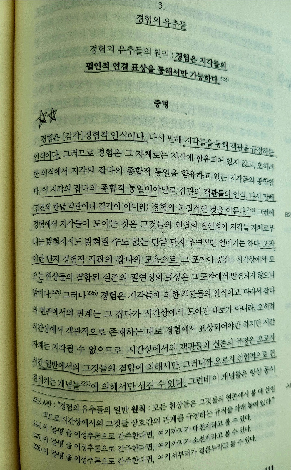 #. [3. 경험의 유추들] 경험은 지각들의 필연적 연결 표상을 통해서만 가능하다. 경험은 (감각)경험적 인식이다. 다시 말해 지각을 통해 객관을 규정하는 인식이다. 지각의 잡다의 종합적 통일이야말로 감관의 객관들의 인식, 다시 말해 (감관의 한낱 직관이나 감각이 아니라) 경험의 본질적인 것을 이룬다.