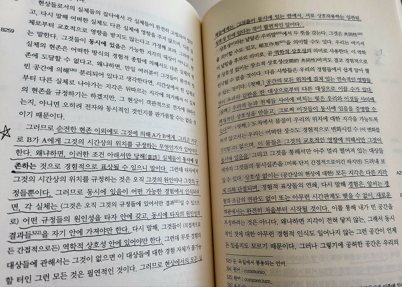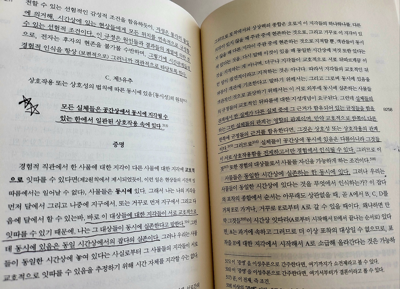 순전한 현존 이외에도 그것에 의해 A가 B에게, 그리고 거꾸로 B가 A에게 그것의 시간상의 위치를 규정하는 무엇인가가 있어야만 한다. 왜냐하면 이러한 조건 아래서만 당해 실체들이 동시에 실존하는 것으로 경험적으로 표상될 수 있으니 말이다. 타자에게 그것의 시간상의 위치를 규정하는 것은 오직 그것의 원인이나 그것의 규정들뿐이다. 그러므로 동시에 있음이 어떤 가능한 경험에서 인식되려면, 각 실체는 어떤 규정들의 원인성을 타자 안에 갖고, 동시에 타자의 원인성의 결과들을 자기 안에 가져야만 한다. 다시 말해, 그것들이 역학적 상호성 안에 있어야만 한다.