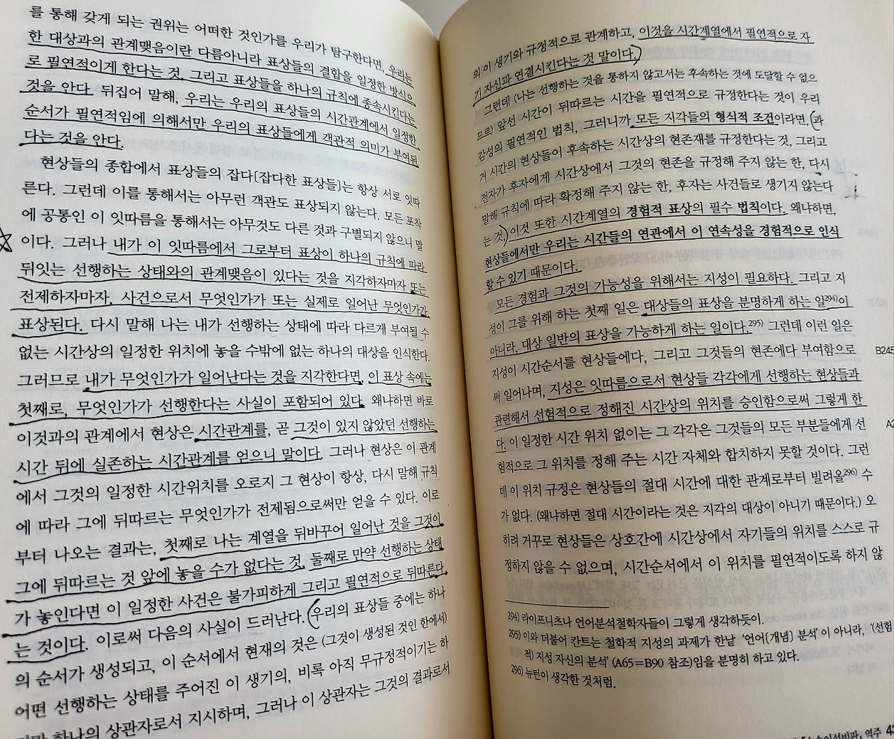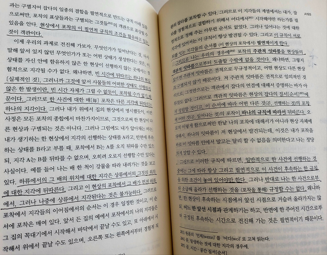 앞선 시간이 뒤따르는 시간을 필연적으로 규정한다는 것이 우리 감성의 필연적인 법칙, 그러니까 모든 지각들의 형식적 조건이라면, 과거 시간의 현상들이 후속하는 시간상의 현존재를 규정한다는 것, 그리고 전자가 후자에게 시간상에서 그것의 현존을 규정해 주지 않는 한, 다시 말해 규칙에 따라 확정해 주지 않는 한, 후자는 사건들로 생기지 않는다는 것, 이것 또한 시간계열의 경험적 표상의 필수 법칙이다. 왜냐하면, 현상들에서만 우리는 시간들의 연관에서 이 연속성을 경험적으로 인식할 수 있기 때문이다. 모든 경험과 그것의 가능성을 위해서는 지성이 필요하다.