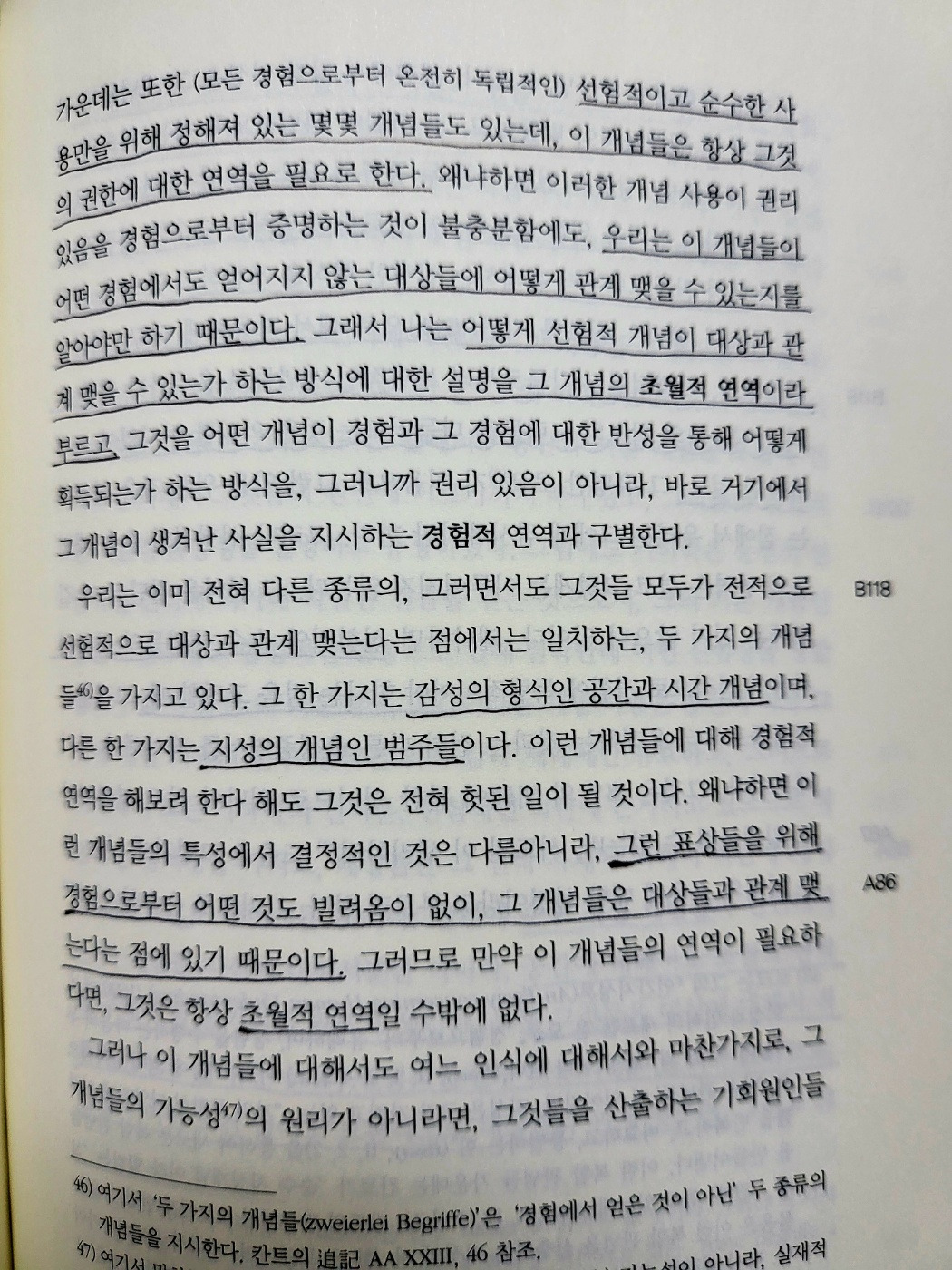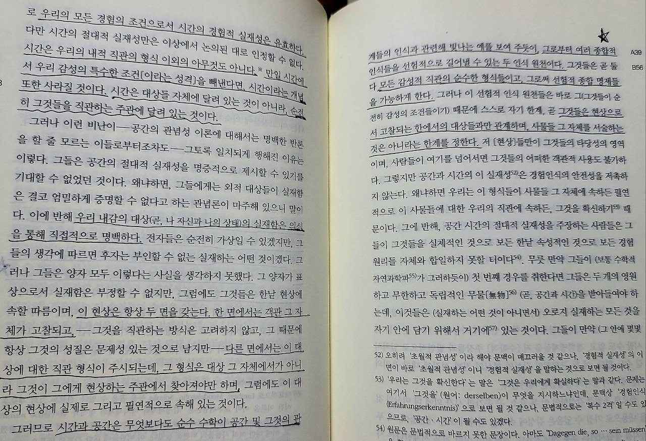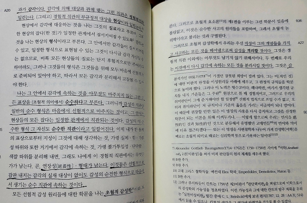 공간과 시간은 그 방식의 순수 형식들이고, 감각 일반은 그 질료이다. 전자를 우리는 오로지 선험적으로 다시 말해 모든 현실적인 지각에 앞서 인식하므로 그것을 순수 직관이라 일컫는다. 그러나 후자는 우리 인식에서 후험적 인식, 다시 말해 경험적 직관이라 일컬어지는 것을 이루는 그런 것이다.