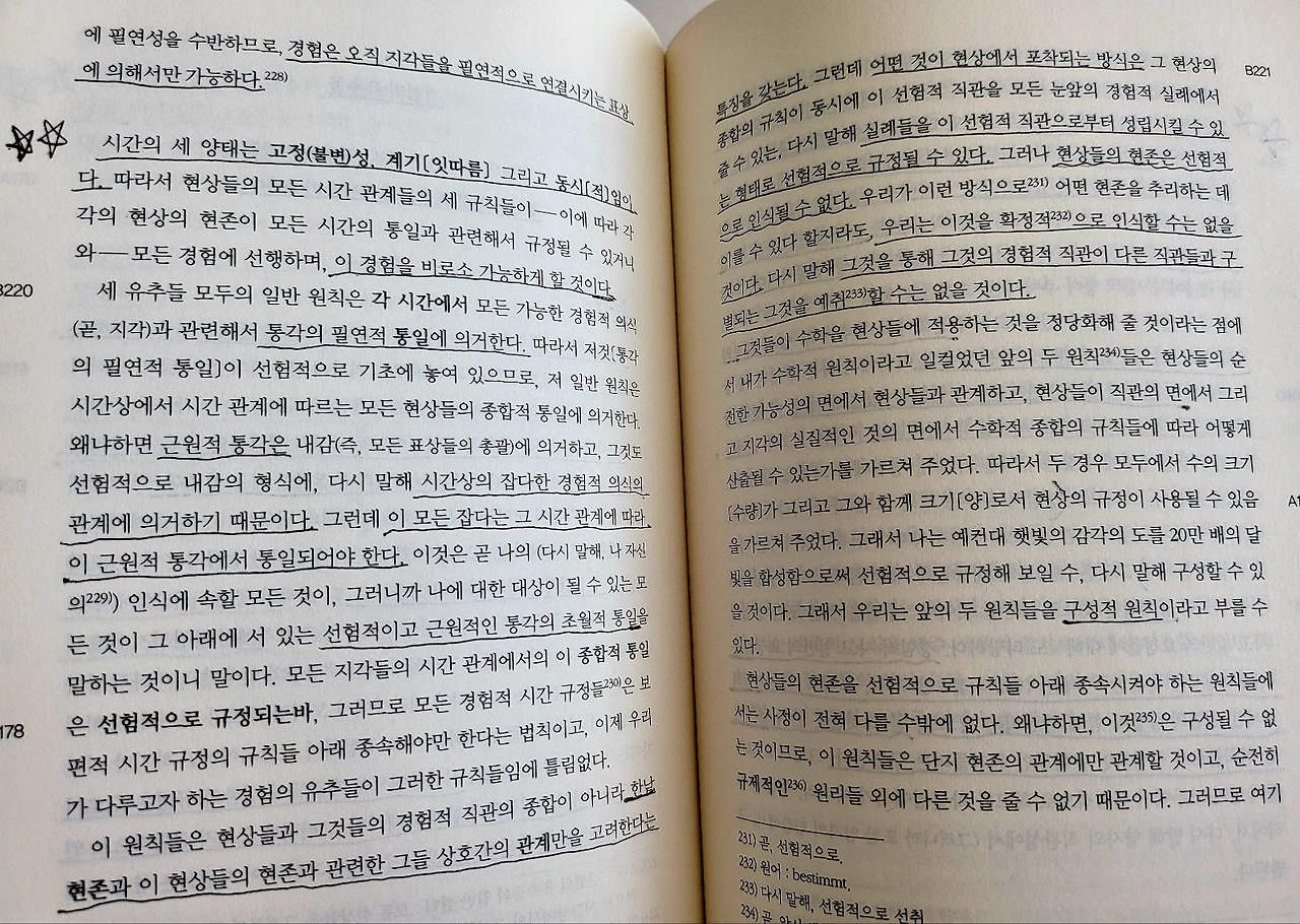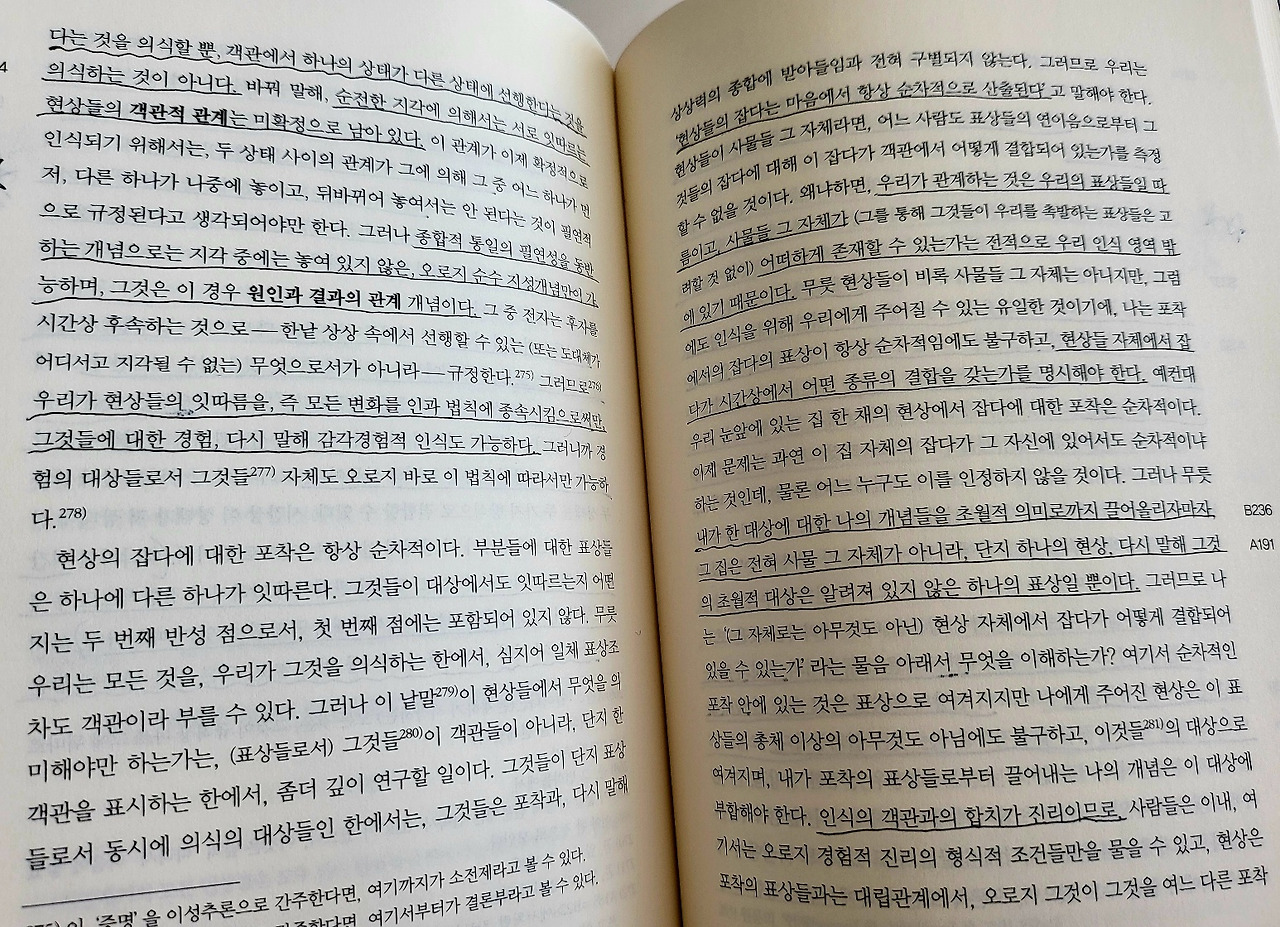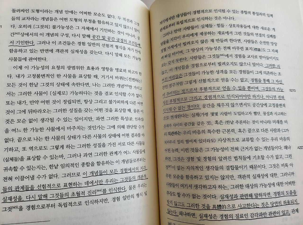 그런 경우 사물의 현존은 가능한 경험 안에서 우리의 지각들과 연관되어 있고, 우리는 저 유추들의 실마리를 따라 우리의 현실적인 지각으로부터 가능한 지각들의 계열 안에 있는 사물에 도달할 수가 있기 때문이다. 우리가 경험에서 출발하지 않거나, 또는 현상들의 경험적 연관 법칙들을 따라 전진하지 않는다면, 우리가 어떤 사물의 현존을 탐색하고 탐구하고자 하는 것은 허장성세일 따름이다.