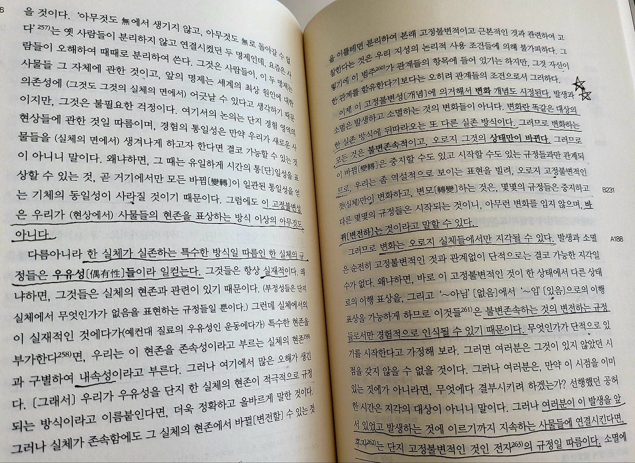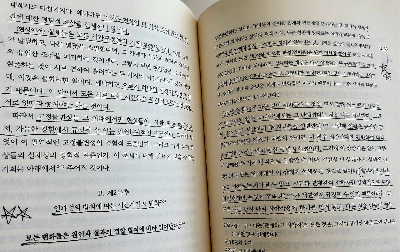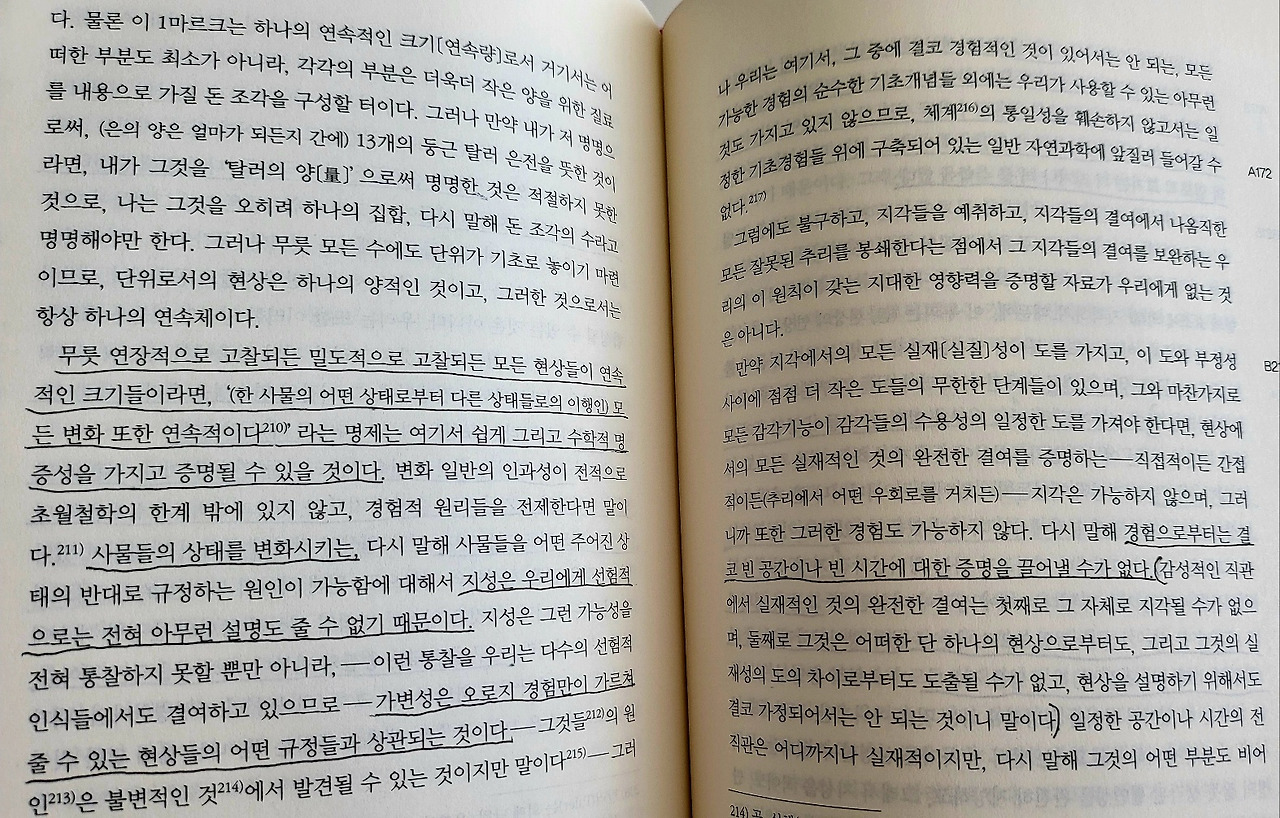무릇 연장적으로 고찰되든 밀도적으로 고찰되든 모든 현상들이 연속적인 크기들이라면, '모든 변화 또한 연속적이다'라는 명제는 여기서 쉽게 그리고 수학적 명증성을 가지고 증명될 수 있을 것이다. 변화 일반의 인과성이 전적으로 초월철학의 한계 밖에 있지 않고, 경험적 원리들을 전제한다면 말이다. 사물들의 상태를 변화시키는, 다시 말해 사물들을 어떤 주어진 상태의 반대로 규정하는 원인이 가능함에 대해서 지성은 우리에게 선험적으로는 전혀 아무런 설명도 줄 수 없기 때문이다. 가변성은 오로지 경험만이 가르쳐줄 수 있는 현상들의 어떤 규정들과 상관되는 것이다.
