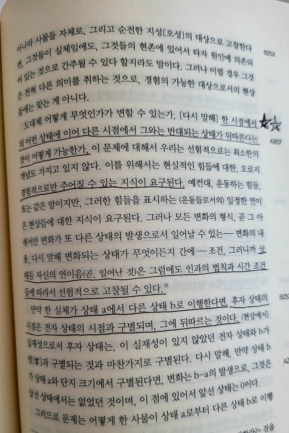 모든 변화의 형식, 곧 그 아래서만 변화가 또 다른 상태의 발생으로서 일어날 수 있는 조건, 그러니까 상태들 자신의 연이음(일어난 것)은 그럼에도 인과의 법칙과 시간 조건들에 따라서 선험적으로 고찰될 수 있다. 만약 한 실체가 상태 a에서 다른 상태 b로 이행한다면, 후자 상태의 시점은 전자 상태의 시점과 구별되며, 그에 뒤따르는 것이다.