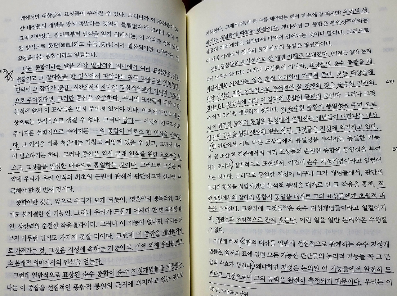 나는 종합이라는 말을 가장 일반적인 의미에서 여러 표상들을 서로 덧붙이고 그 잡다함을 한 인식에서 파악하는 활동 작용으로 이해한다. 만약에 그 잡다가 경험적으로가 아니라 선험적으로 주어진다면, 그러한 종합은 순수하다. 종합은 본래 인식을 위한 요소들을 모으고, 그것들을 일정한 내용으로 통일하는 것이다.