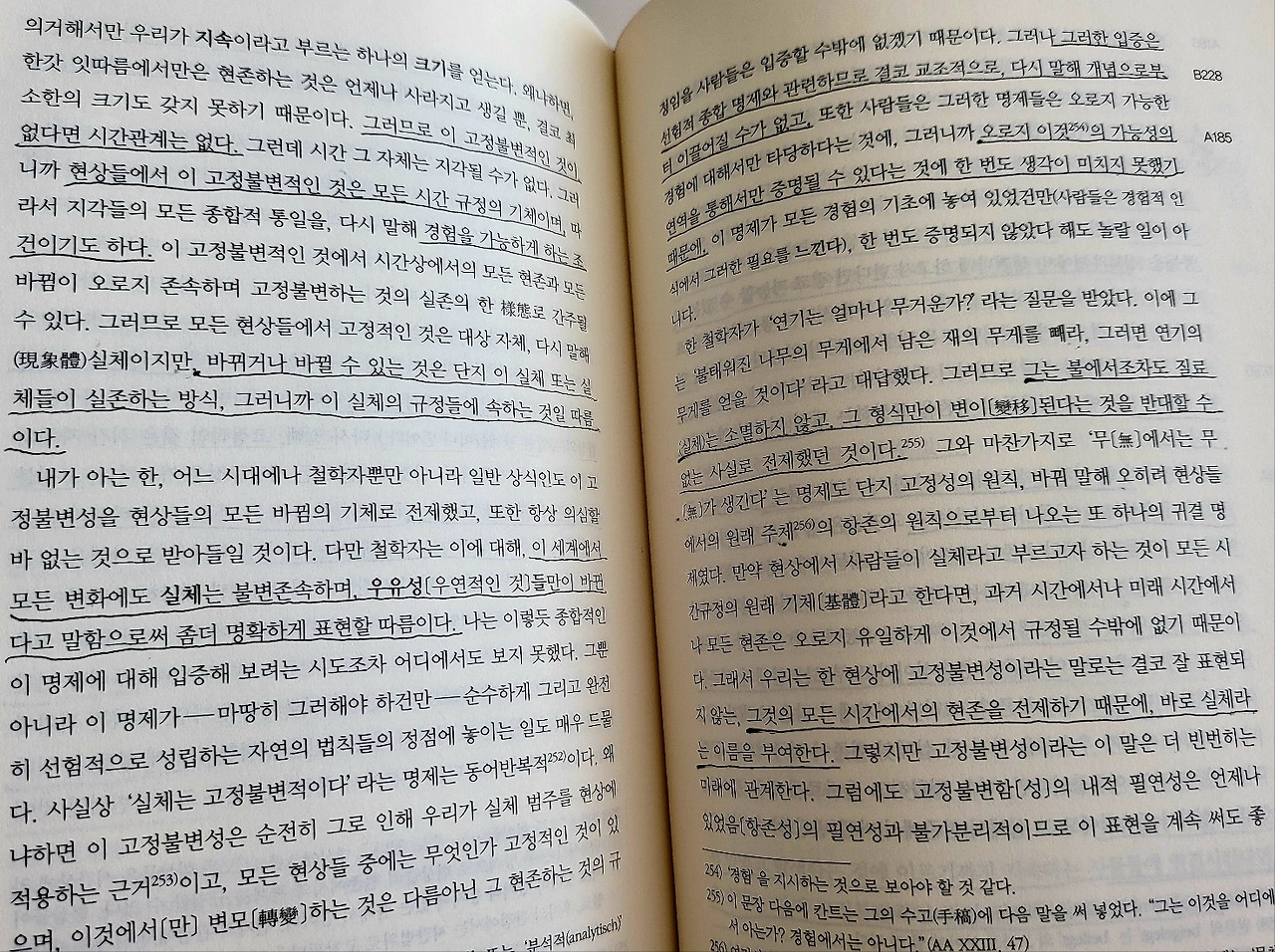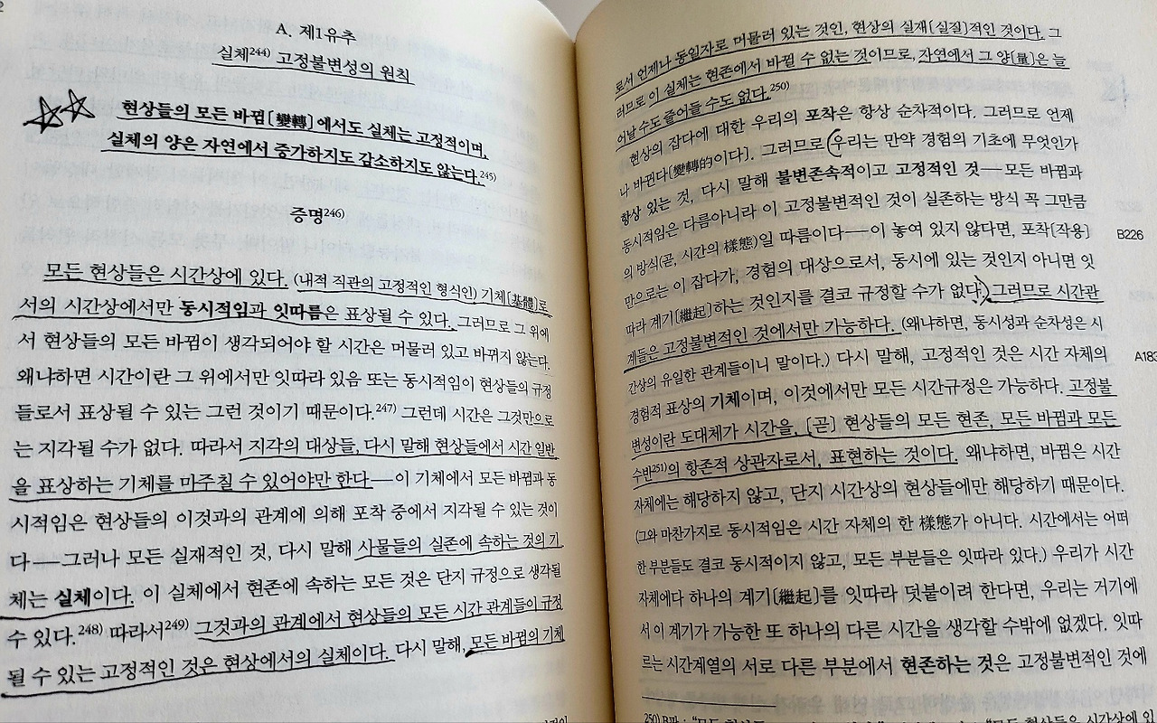 고정불변적인 것이 없다면 시간관계는 없다. 시간 그 자체는 지각될 수가 없다. 그러니까 현상들에서 이 고정불변적인 것은 모든 시간 규정의 기체이며, 따라서 지각들의 모든 종합적 통일을, 다시 말해 경험을 가능하게 하는 조건이기도 하다. 철학자는 이 세계에서 모든 변화에도 실체는 불변존속하며, 우유성(우연적인 것)들만이 바뀐다고 말함으로써 좀 더 명확하게 표현할 따름이다.