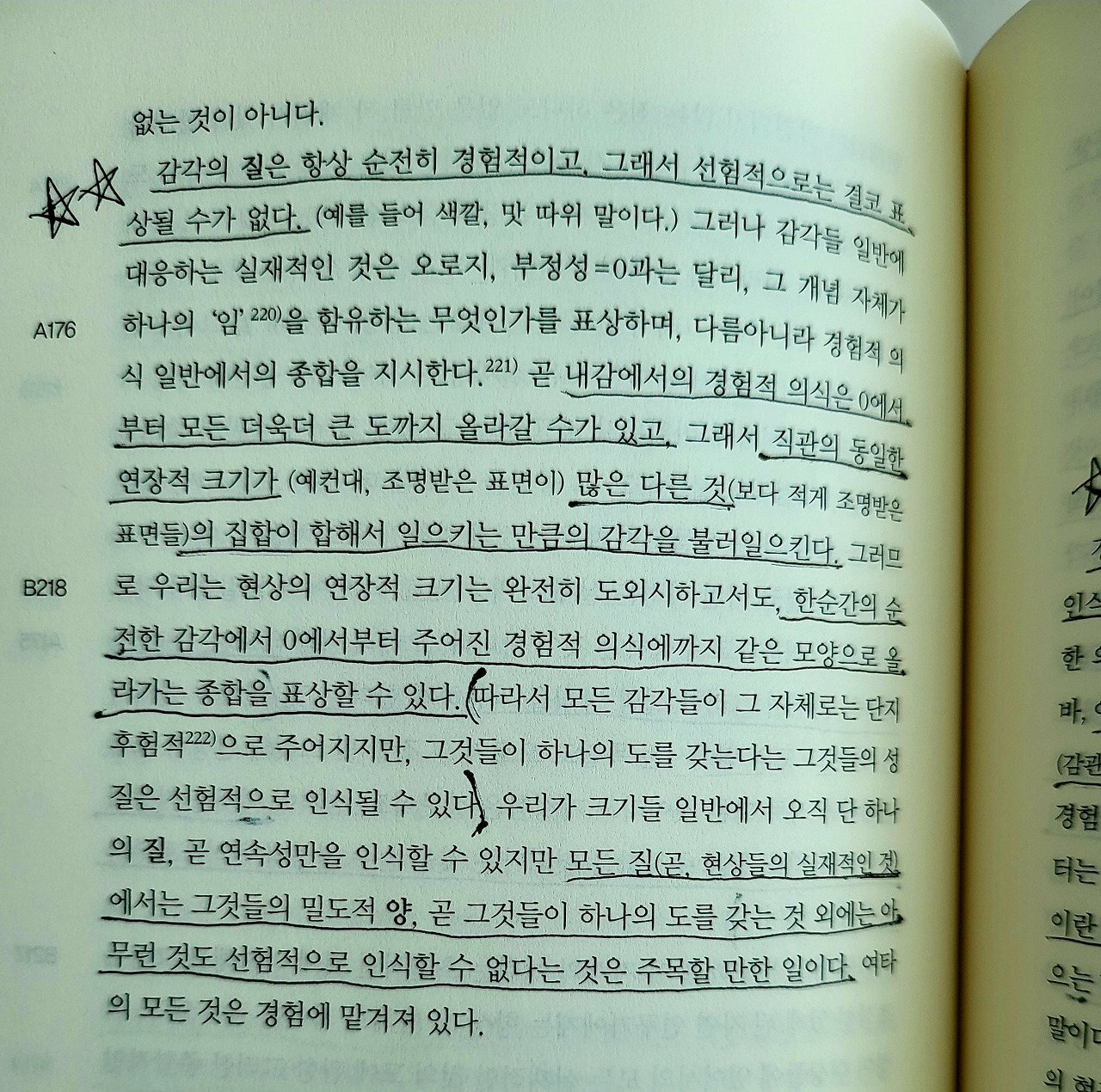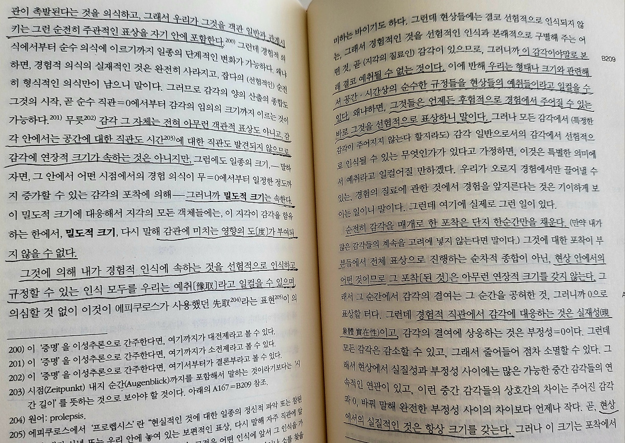 무릇 감각 그 자체는 전혀 아무런 객관적 표상도 아니고, 감각 안에서는 공간에 대한 직관도 시간에 대한 직관도 발견되지 않으므로 감각에 연장적 크기가 속하는 것은 아니지만, 그럼에도 일종의 크기, 그러니까 밀도적 크기는 속한다. 이 밀도적 크기에 대응해서 지각의 모든 객체들에는, 감관에 미치는 영향의 도가 부여되지 않을 수 없다. 그것에 의해 내가 경험적 인식에 속하는 것을 선험적으로 인식하고 규정할 수 있는 인식 모두를 우리는 예취라고 일컬을 수 있다.