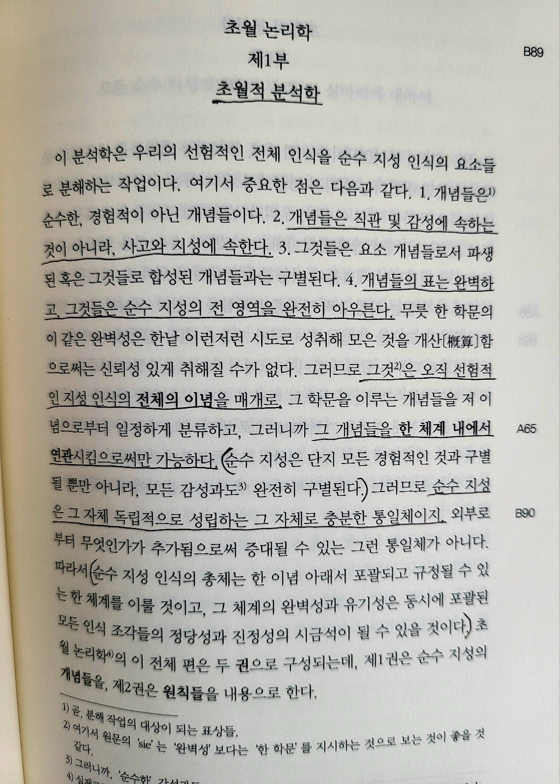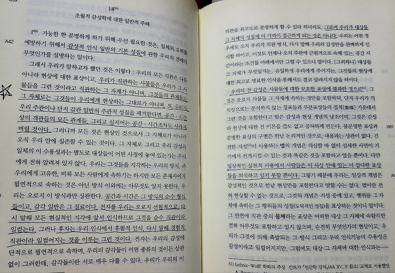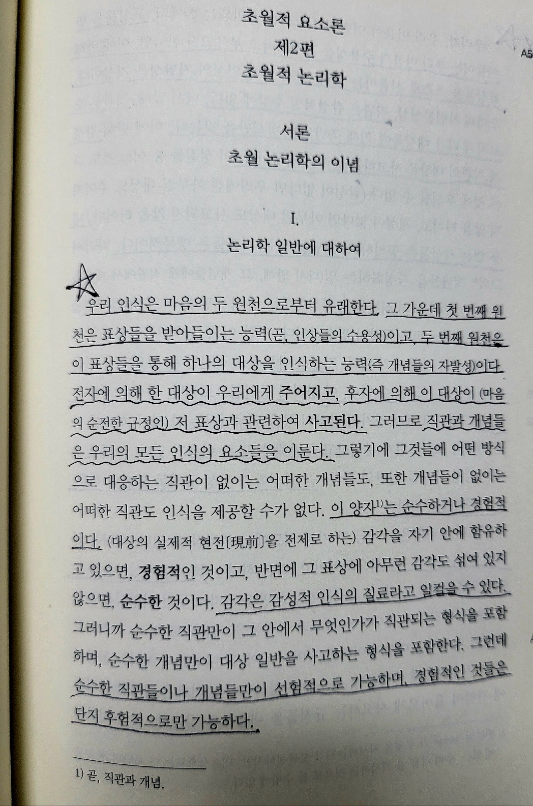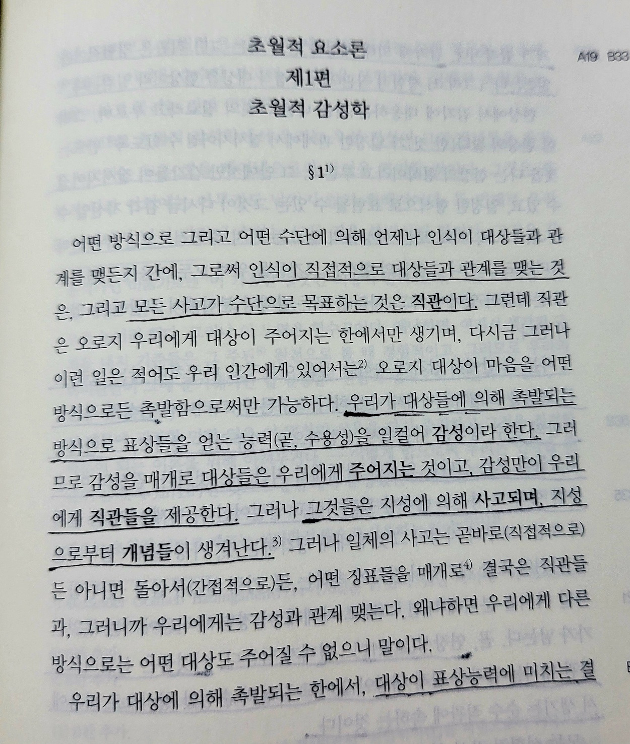 #. [초월적 감성학] 인식이 직접적으로 대상들과 관계를 맺는 것은, 그리고 모든 사고가 수단으로 목표하는 것은 직관이다. 우리가 대상들에 의해 촉발되는 방식으로 표상들을 얻는 능력(수용성)을 일컬어 감성이라 한다. 그러므로 감성을 매개로 대상들은 우리에게 주어지는 것이고, 감성만이 우리에게 직관들을 제공한다. 그러나 그것들은 지성에 의해 사고되며, 지성으로부터 개념들이 생겨난다.