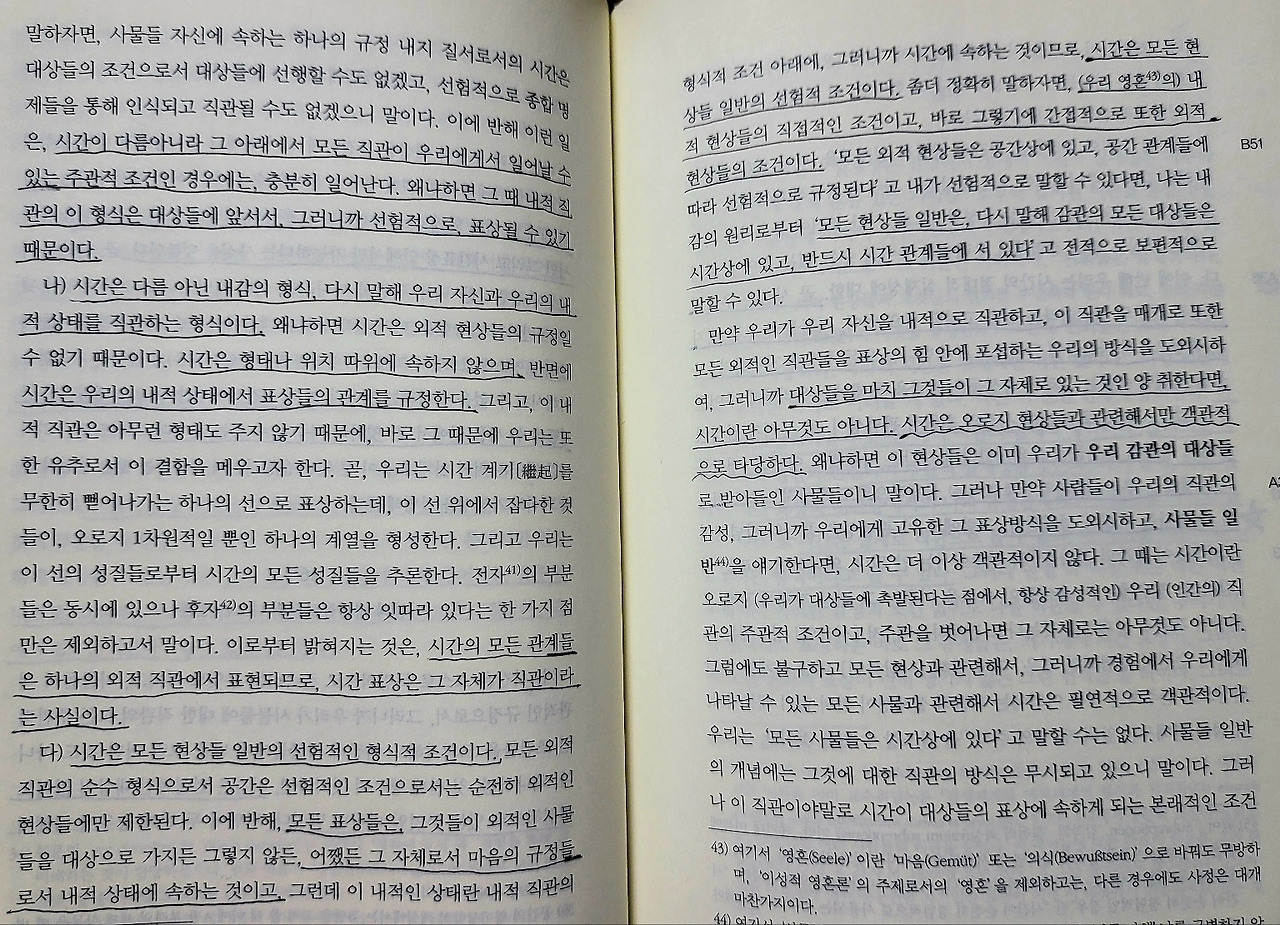 시간은 다름 아닌 내감의 형식, 다시 말해 우리 자신과 우리의 내적 상태를 직관하는 형식이다. 왜냐하면 시간은 외적 현상들의 규정일 수 없기 때문이다. 시간은 형태나 위치 따위에 속하지 않으며, 반면에 시간은 우리의 내적 상태에서 표상들의 관계를 규정한다.