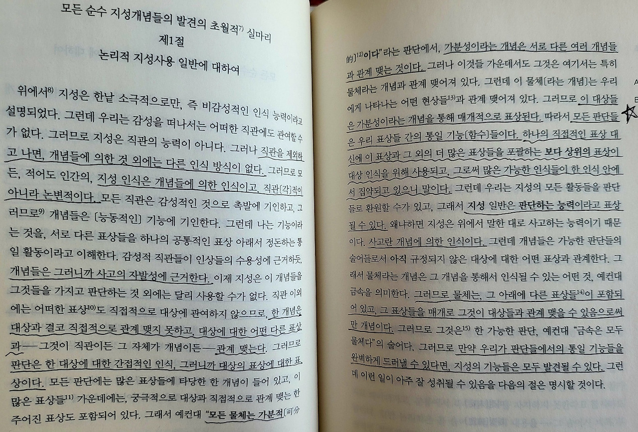 표상들을 받아들이는 우리 마음의 수용성을 감성이라고 부르고자 한다면, 이에 반해 표상들을 스스로 산출하는 능력, 바꿔 말해 인식의 자발성은 지성이다. 우리의 자연본성상, 직관은 감성적일 수밖에 없다. 다시 말해 직관은 오로지 우리가 대상들에 의해 촉발되는 방식만을 갖는다. 이에 반해 감성적 직관의 대상을 사고하는 능력은 지성이다. 감성이 없다면 우리에겐 아무런 대상도 주어지지 않을 터이고, 지성이 없다면 아무런 대상도 사고되지 않을 터이다. 내용 없는 사상들은 공허하고, 개념들 없는 직관들은 맹목적이다. 이 양자가 통일됨으로써만, 인식은 생길 수 있다.