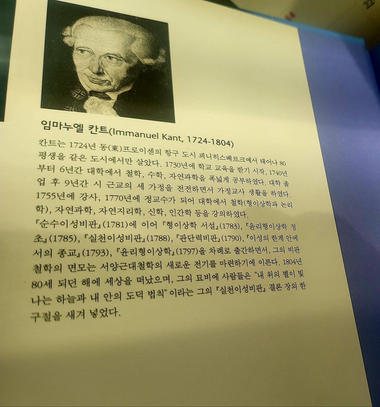프로이센 왕국 출신의 철학자. 서양 근대 철학사에서 대륙의 합리주의와 영국의 경험주의를 종합해 '선험적 종합 판단'이라는 '코페르니쿠스적 혁명'을 일으켰다고 평가받으며, 인식론, 형이상학, 윤리학, 미학 등 분야를 막론하고 서양 철학의 전 분야에 큰 발자취를 남겼다. 칸트가 남긴 저작 가운데 3대 비판서인 <순수이성비판>, <실천이성비판>, <판단력비판>이 유명하다. 사망한 지 200년이 흐른 지금도 근현대 철학의 중심 인물로 평가받는다. 독일 관념론의 출발점이자 계몽주의의 완성자라는 별칭도 있다. 칸트의 영향력은 자신이 살았던 시대의 근대 철학에 국한되지 않으며, 현대 철학에서도 칸트의 영향력을 쉽게 찾아볼 수 있다. 특히 칸트의 윤리학은 밀의 윤리학과 더불어 현대 윤리학의 중요한 두 축 중 하나이다.