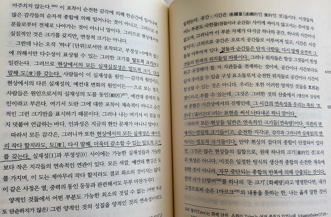 모든 현상들 일반은 연속적인 크기들(연속량)이다. 직관의 면에서는 연장적 크기들이고, 순전한 지각(감각과 그러니까 실재성)의 면에서는 밀도적 크기들이다. 만약 현상의 잡다의 종합이 단절되어 있다면, 그것은 많은 현상들의 집합으로, 원래 하나의 크기로서의 현상은 아니다. 이것은 일정한 방식의 생산적 종합의 순전한 계속에 의한 것이 아니라, 자꾸 중단되는 종합의 반복에 의해 산출되는 것이다.