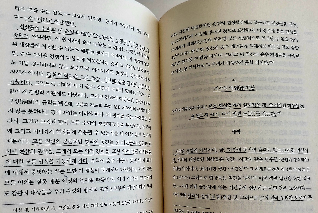 현상들은 모두 크기들이며, 그것도 연장적 크기들이다. 왜냐하면 현상들은 공간 또는 시간상의 직관들로서, 그에 의해 공간 시간 일반이 규정되는 바로 그 종합에 의해서 표상될 수밖에 없는 것이기 때문이다.
