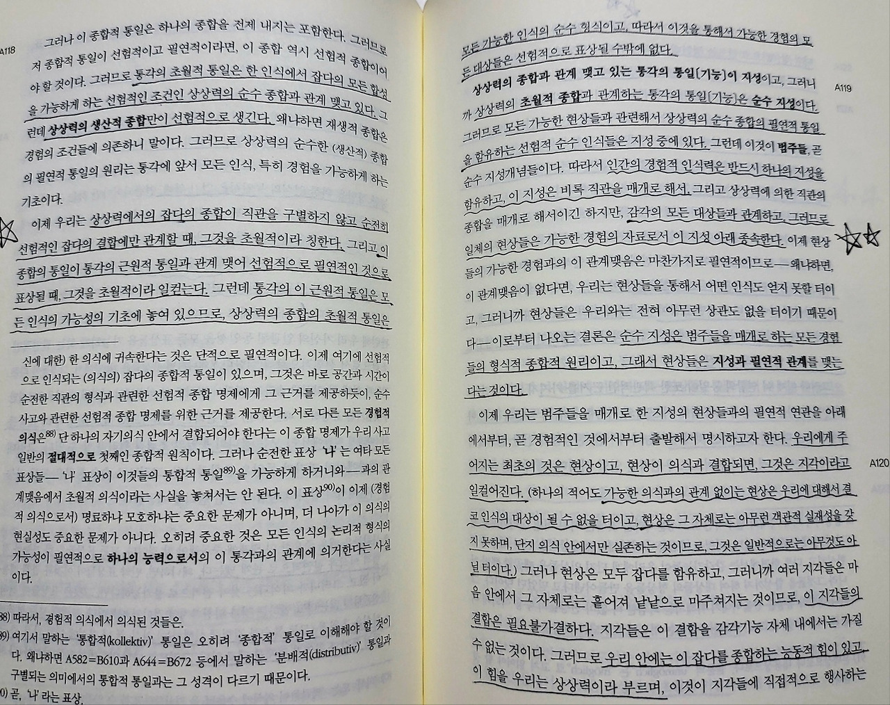 상상력에서의 잡다의 종합이 직관을 구별하지 않고 순전히 선험적인 잡다의 결합에만 관계할 때, 그것을 초월적이라 칭한다. 그리고 이 종합의 통일이 통각의 근원적 통일과 관계 맺어 선험적으로 필연적인 것으로 표상될 때, 그것을 초월적이라 일컫는다. 그런데 통각의 이 근원적 통일은 모든 인식의 가능성의 기초에 놓여 있으므로, 상상력의 종합의 초월적 통일은 모든 가능한 인식의 순수 형식이고, 따라서 이것을 통해서 가능한 경험의 모든 대상들은 선험적으로 표상될 수밖에 없다.