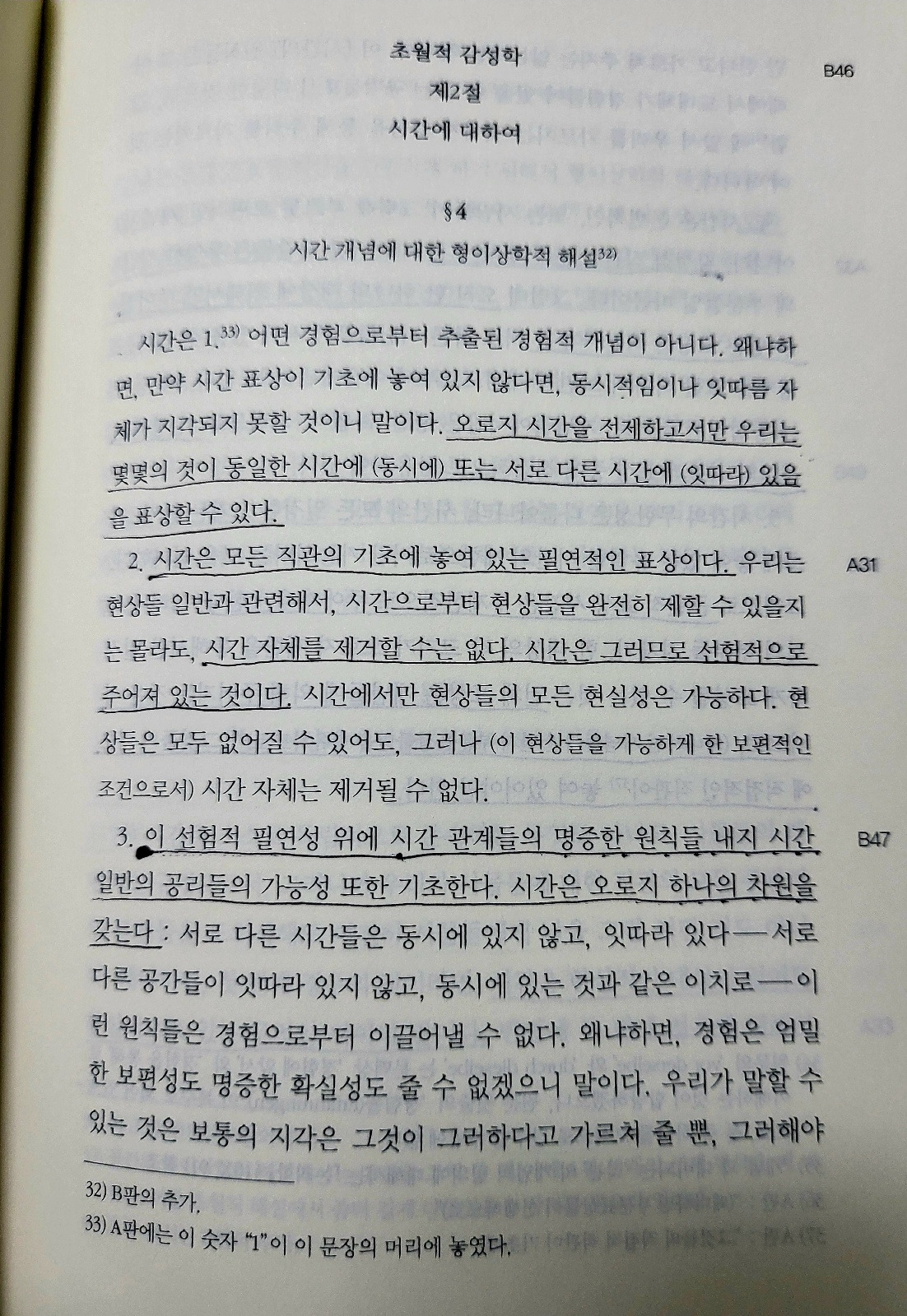 시간은 우리의 내적 직관의 형식 이외의 아무것도 아니다. 만일 시간에서 우리 감성의 특수한 조건을 빼낸다면, 시간이라는 개념 또한 사라질 것이다. 시간은 대상들 자체에 달려 있는 것이 아니라, 순전히 그것들을 직관하는 주관에 달려 있는 것이다.