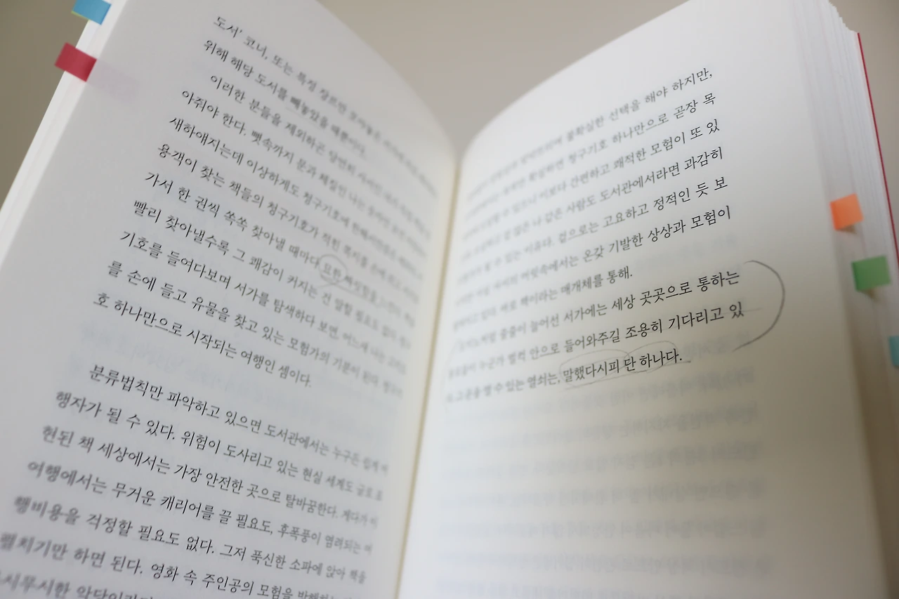 도서관의 시간은 늘 비슷비슷 흘러가지만 도서관이 마치 광활한 우주 같다고 말한 저자는 항해사가 되어 그 안을 별 하나에도, 아끼고 사랑하는 마음을 가지고 있었다.