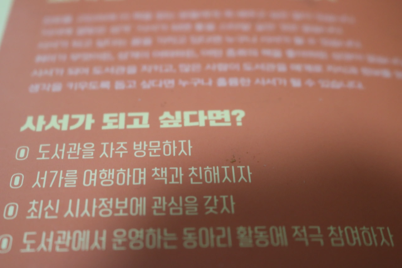 사서가 되고 싶다면 먼저 도서관을 자주 방문해야 한다. 도서관의 시설과 분위기, 공간을 돌아보며 익숙해져야 한다. 익숙하다는 것은 도서관 이용의 효과성을 높일 뿐만 아니라 다양한 공간 활용에 접촉한 시간이 훗날 깊게 들여다볼 수 있는 힘을 키울 수 있다는 것.