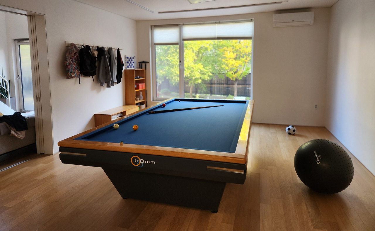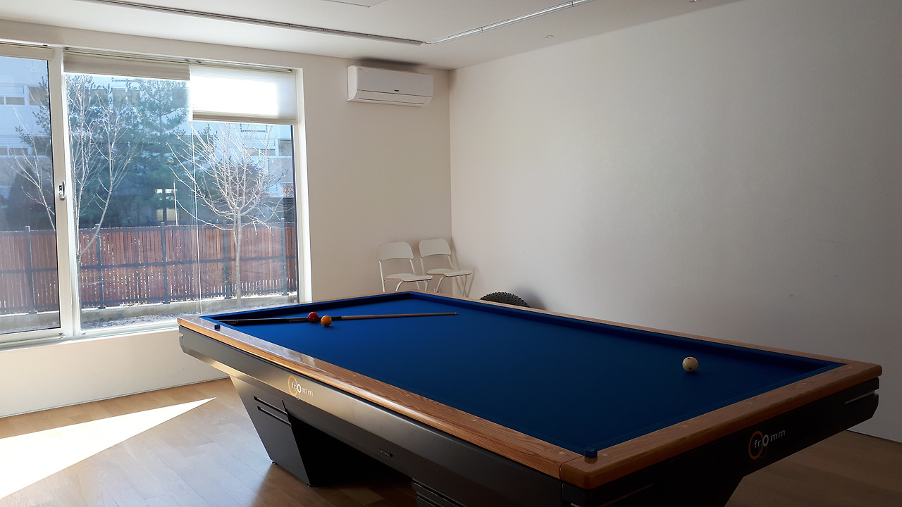 미닫이문을 통해 들어가면 크나큰 국제식 대대가 있습니다. 당구대 설치 직후 반짝반짝 새것 일 때의 모습입니다. 지금은 파란 천에 얼룩덜룩 먼지와 때가 묻어 세월의 흔적이 보입니다. 애초에 설계사무소에서는 당구장의 벽과 천장 마감을 미송 합판으로 하고 천장은 나무 간살처럼 디자인해서 다른 공간이라는 차별성을 주고자 했었는데요, 남편은 인테리어에 관심이 없고, 저는 하얗고 미니멀한 디자인에 꽂혀 있어서 그냥 하얀 방에 당구대가 덜렁 있는 당구장이 되었네요. 설계사무소의 디자인을 따랐다면 더 멋졌을 거 같습니다. 쩝.